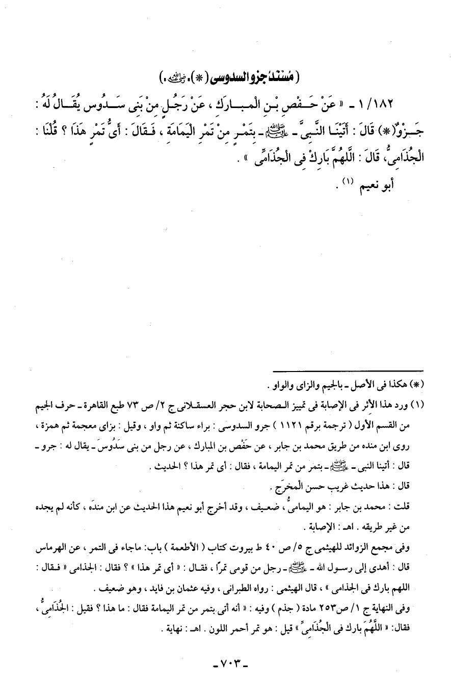 182/ 1 - " عَنْ حَفْصِ بْنِ الْمبارَكِ، عَنْ رَجُلٍ مِنْ بَنِى سَدُوس يُقَالُ لَهُ: جَزْوٌ (*) قَالَ: أَتَيْنَا النَّبِىَّ - صلى الله عليه وسلم - بِتَمْرٍ مِنْ تَمْرِ الْيَمَامَةِ، فَقَالَ: أَىُّ تَمْرٍ هَذَا؟ قُلْنَا: الْجُذَامِىُّ، قَالَ: الَّلهُمَّ بَارِكْ فِى الْجُذَامِّى".