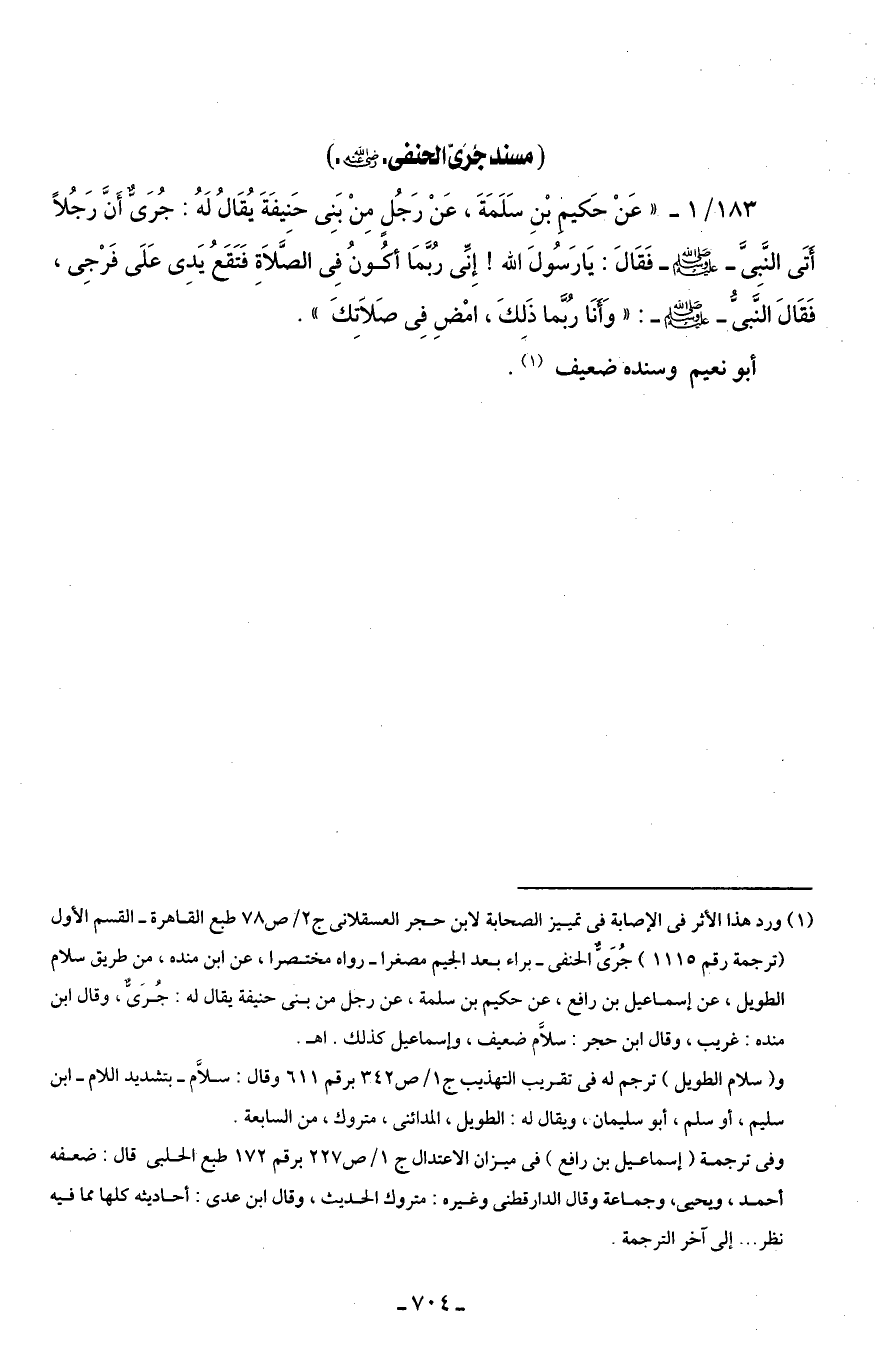 183/ 1 - " عَنْ حَكيمِ بْنِ سَلَمَةَ، عَنْ رَجُلٍ مِنْ بَنِى حَنِيفَةَ يُقَالُ لَهُ: جُرَىٌّ أَنَّ رَجُلًا أَتَى النَّبِىَّ - صلى الله عليه وسلم - فَقَالَ: يَا رَسُولَ الله! إِنِّى رُبَّمَا أكُونُ فِى الصَّلَاةِ فَتَقَعُ يَدِى عَلَى فَرْجِى، فَقَالَ النَّبىُّ - صلى الله عليه وسلم -: "وَأَنَا رُبَّما ذَلِكَ، امْضِ فِى صَلَاتِكَ".