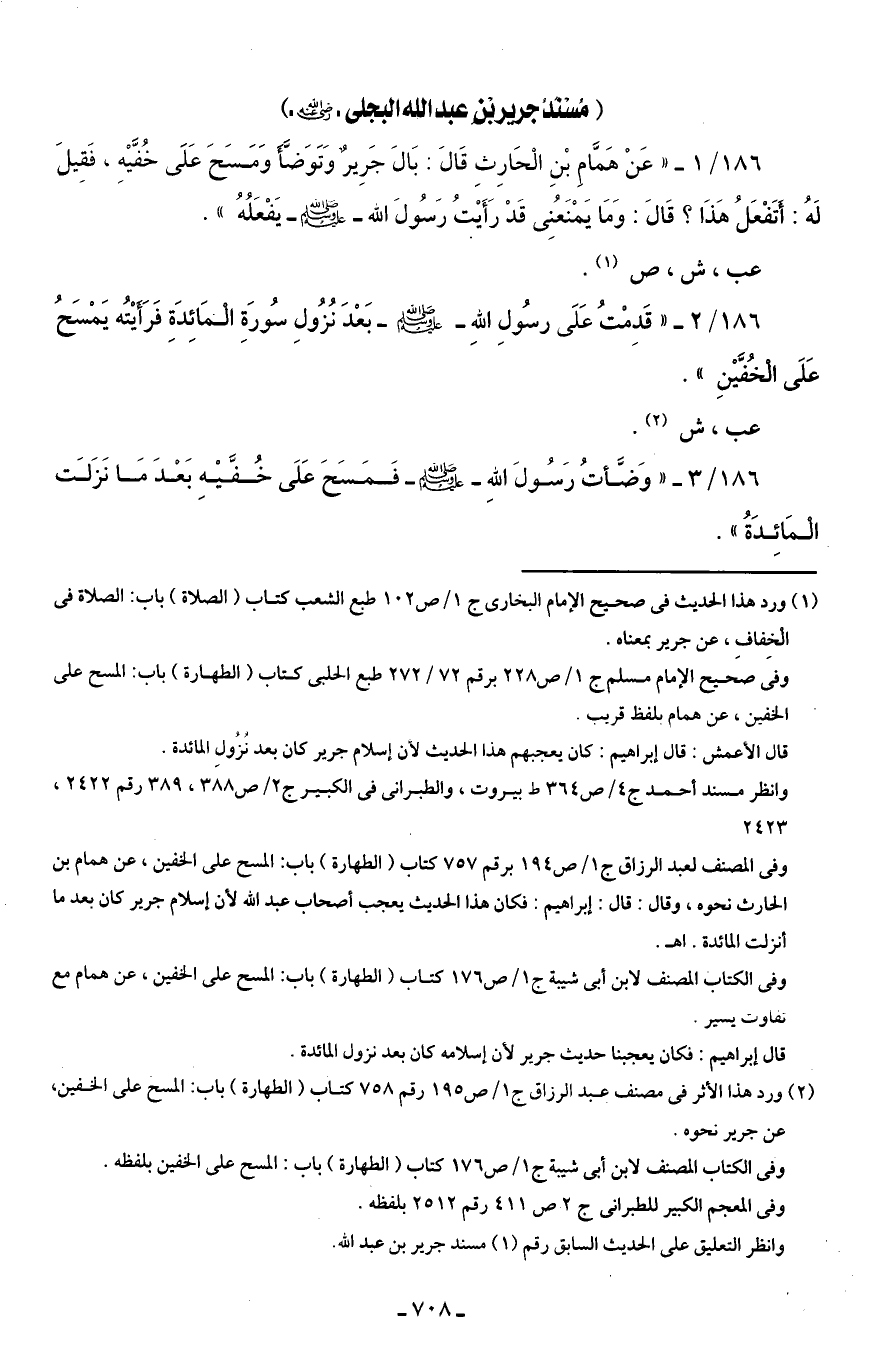 186/ 2 - "قَدِمْتُ عَلَى رسُولِ اللهِ - صلى الله عليه وسلم - بَعْدَ نُزُولِ سُورَةِ الْمَائِدَةِ فَرَأَيْتُه يَمْسَحُ عَلَى الخُفَّيْنِ".