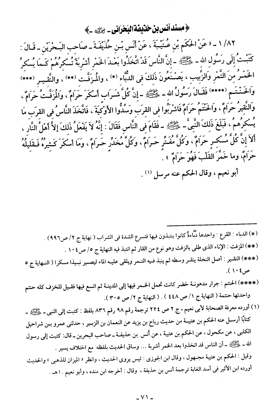 82/ 1 - " عَنْ الحَكَم بْنِ عُتَيْبَةَ، عَنْ أَنَسِ بْنِ حُذَيْفَةَ - صَاحِبِ البَحْرَيْنِ - قَالَ: كَتَبْتُ إِلَى رَسُولِ الله - صلى الله عليه وسلم - إِنَّ النَّاسَ قَدْ اتَّخَذُوا بَعْدَ الخَمْرِ أَشْرِبَةً تُسْكِرُهُمْ كَمَا يُسْكِرُ الخَمْرُ مِنَ التَّمْرِ وَالزَّبِيبِ، يَصْنَعُونَ ذَلكَ فِى الدُّبَّاء (*)، والمُزَفَّتِ (* *)، والنَّقِيرِ (* * *) وَالحَنْتَم (* * * *) فَقَالَ رَسُولُ اللهِ - صلى الله عليه وسلم - إِنَّ كُلَّ شَرَابٍ أَسْكَرَ حَرَامٌ، وَالمُزَفَّتُ حَرَامٌ، وَالنَّقِيرُ حَرَامٌ، وَالحَنْتَمُ حَرَامٌ فَاشْرَبُوا فِى القِرَبِ وَسُدُّوا الأَوْكيَةَ، فَاتَّخَذَ النَّاسُ فِى القِرَبِ مَا يُسْكِرُهمُ، فَبَلغَ ذَلِكَ النَّبِىَّ - صلى الله عليه وسلم - فَقَامَ فِى النَّاسِ فَقَالَ: إِنَّهُ لاَ يَفْعَلُ ذَلِكَ إلاَّ أَهْلُ النَّارِ، أَلاَ إِنَّ كُلَّ مُسْكِر حَرَامٌ، وَكُلَّ مُفَتِّرٍ حَرَامٌ، وَكُلَّ مُخَدِّرٍ حَرَامٌ، وَمَا أسْكَرَ كَثِيرُهُ فَقَليلُهُ حَرَامٌ، وما خَمَّرَ القَلبَ فَهُوَ حَرَامٌ ".