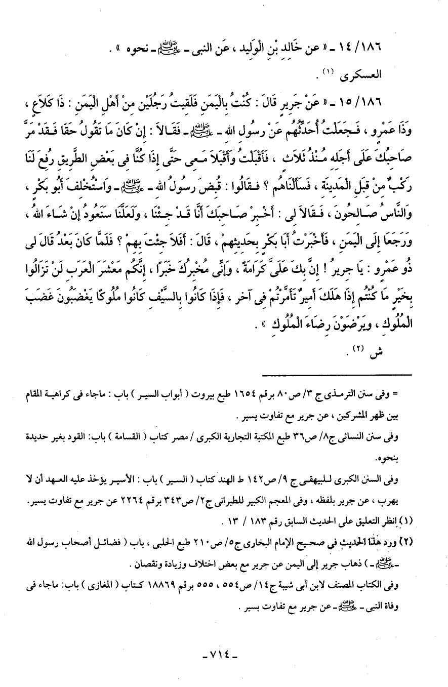 186/ 15 - "عَنْ جَرِيرٍ قَالَ: كُنْتُ بِالْيَمَنِ فَلَقِيتُ رَجُلَيْن مِنْ أَهْلِ الْيَمَنِ: ذَا كَلَاعٍ، وَذَا عَمْرٍو، فَجَعَلْتُ أُحَدَّثُهُم عَنْ رسُولِ اللهِ - صلى الله عليه وسلم - فَقَالَا: إِنْ كَانَ مَا تَقُولُ حَقّا فَقَدْ مَرَّ صَاحِبُكَ عَلَى أَجَلِهِ مُنْذُ ثَلَاثٍ، فَأَقْبَلْتُ وَأَقبَلَا مَعِى حتَّى إِذَا كُنَّا في بَعْضِ الطَّرِيقِ رُفِعَ لَنَا رَكْبٌ مِنْ قِبَلِ الْمَدِينَةِ، فَسَأَلْنَاهُم؟ فقَالُوا: قُبِضَ رسُولُ اللهِ - صلى الله عليه وسلم - وَاسْتُخْلِفَ أَبُو بَكْرٍ، وَالنَّاسُ صَالِحُونَ، فَقَالَا لِى: أَخْبِرْ صَاحِبَكَ أنَّا قَدْ جِئْنَا، وَلَعَلَّنَا سَنَعُودُ إنْ شَاءَ اللهُ، وَرَجَعَا إِلَى الْيَمَنِ، فَأَخْبَرْتُ أَبَا بَكْرٍ بِحَدِيثِهمْ، قَالَ: أَفَلَا جِئْتَ بِهِمْ؟ فَلَمَّا كَانَ بَعْدُ قَالَ لى ذُو عَمْرٍو: يَا جِريرُ! إِنَّ بِكَ عَلَىَّ كرَامَةً، وَإنِّي مُخْبِرُكَ خَبَرًا، إِنَّكُم مَعْشَرَ العَرَبِ لَنْ تَزَالُوا بِخَيْرٍ مَا كُنْتُم إِذَا هَلَكَ أَمِيرٌ تَأَمَّرْتُمْ في آخر، فَإِذَا كَانُوا بِالسَّيْفِ كَانُوا مُلُوكًا يَغْضَبُونَ غَضَبَ الْمُلُوكِ، وَيرْضَوْنَ رِضَاءَ الْمُلُوكِ".