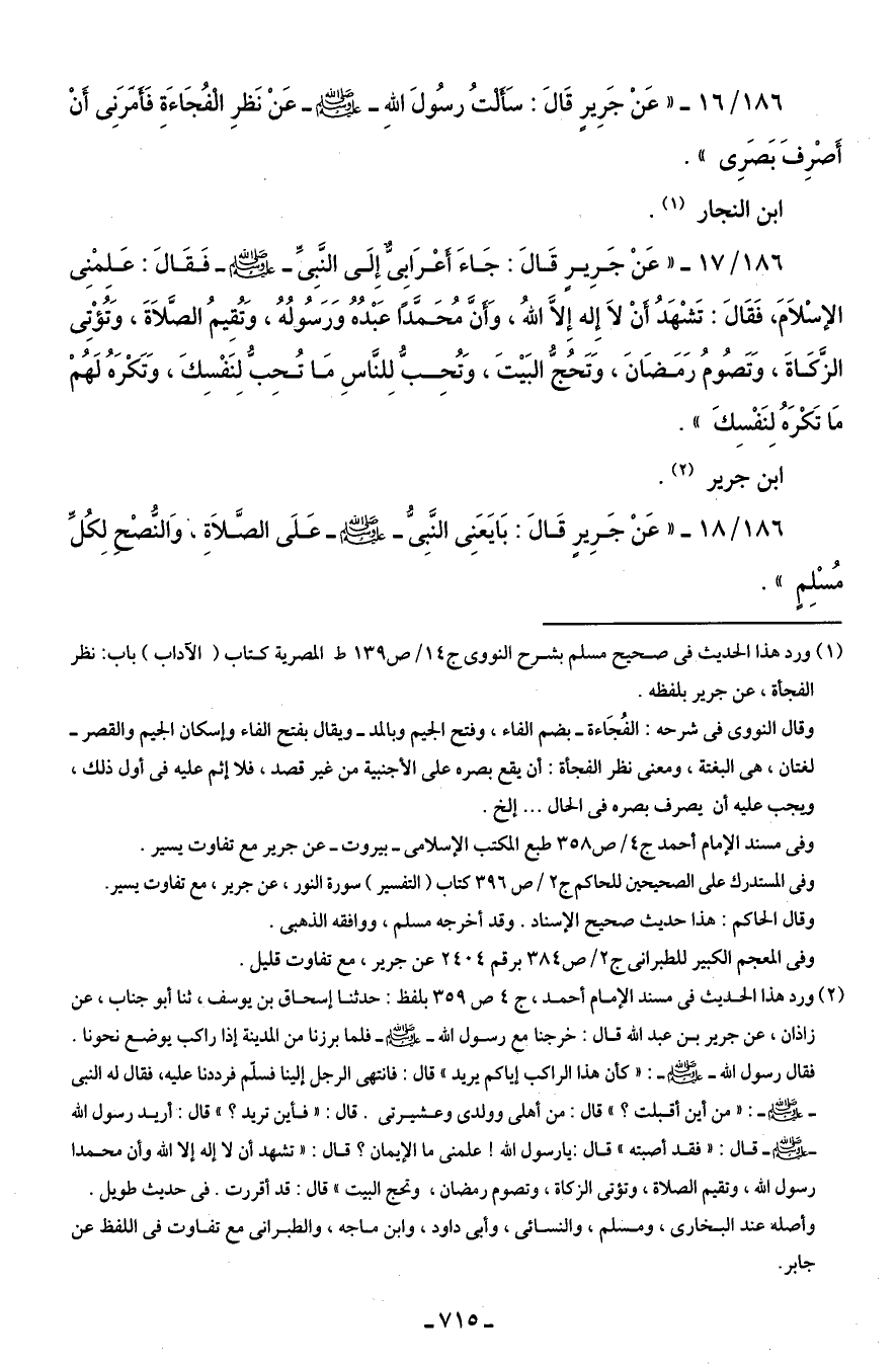 186/ 18 - "عَنْ جَرِيرٍ قَالَ: بَايَعَنِى النَّبِىُّ - صلى الله عليه وسلم - عَلَى الصَّلَاةِ، وَالنُّصْحِ لِكُلِّ مُسْلِمٍ".