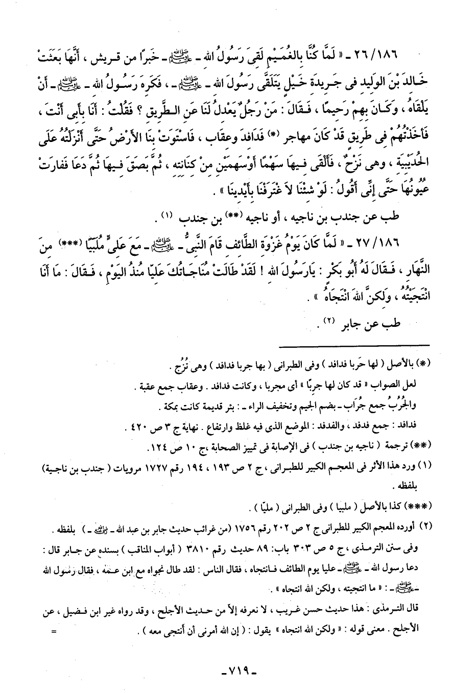 186/ 27 - "لمَّا كَانَ يَوْمُ غَزْوَةِ الطَّائِفِ قَامَ النَّبِيُّ - صلى الله عليه وسلم - مَعَ عَلِيٍّ مُلَبّيًا (* * *) مِنَ النَّهَارِ، فَقَالَ لَهُ أَبُو بَكْرٍ: يَا رَسُولَ اللهِ! لَقَدْ طَالَتْ مُنَاجَاتُكَ عَلِيّا مُنذُ اليَوْمِ، فَقَالَ: مَا أنَا انْتَجَيْتُهُ، وَلِكنَّ اللهَ انْتَجَاهُ".
