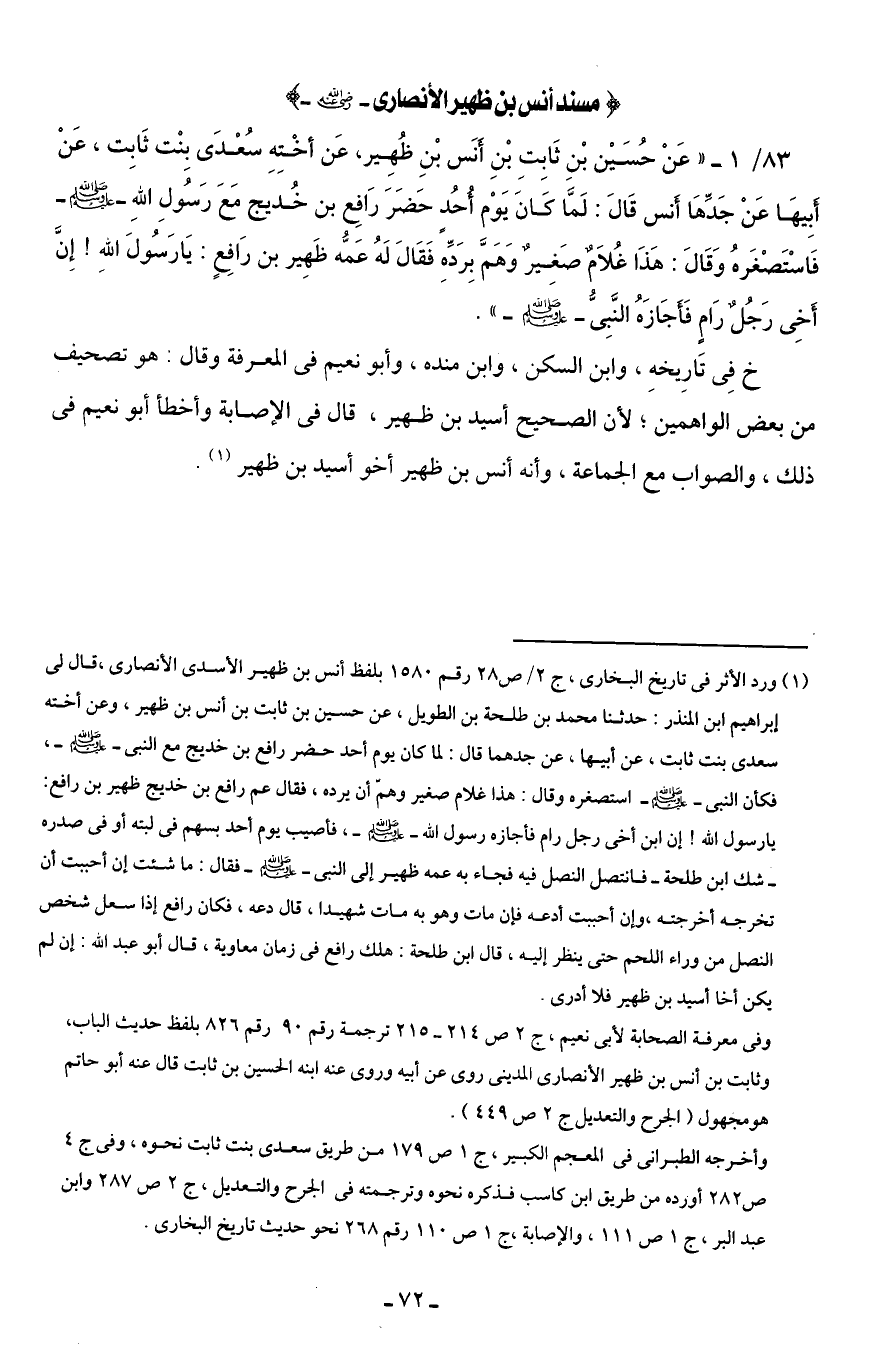 83/ 1 - " عَنْ حُسَيْن بْنِ ثَابِتِ بْنِ أَنَس بْنِ ظُهِير، عَن أخْتِهِ سُعْدَى بِنْت ثَابِتٍ، عَنْ أَبِيهَا عَنْ جَدِّهَا أَنس قَالَ: لَمَّا كَانَ يَوْم أُحُدٍ حَضَرَ رَافِع بن خُديج مَعَ رَسُولِ اللهِ - صلى الله عليه وسلم - فَاسْتَصْغَرهُ وَقَالَ: هَذَا غُلاَمٌ صَغيرٌ وَهَمَّ بِرَدِّهِ فَقَالَ لَهُ عَمُّه ظَهِير بن رَافِعٍ: يَارَسُولَ اللهِ! إِنَّ أَخِى رَجُلٌ رَامٍ فأَجَازَ النَّبِىُّ - صلى الله عليه وسلم - ".
