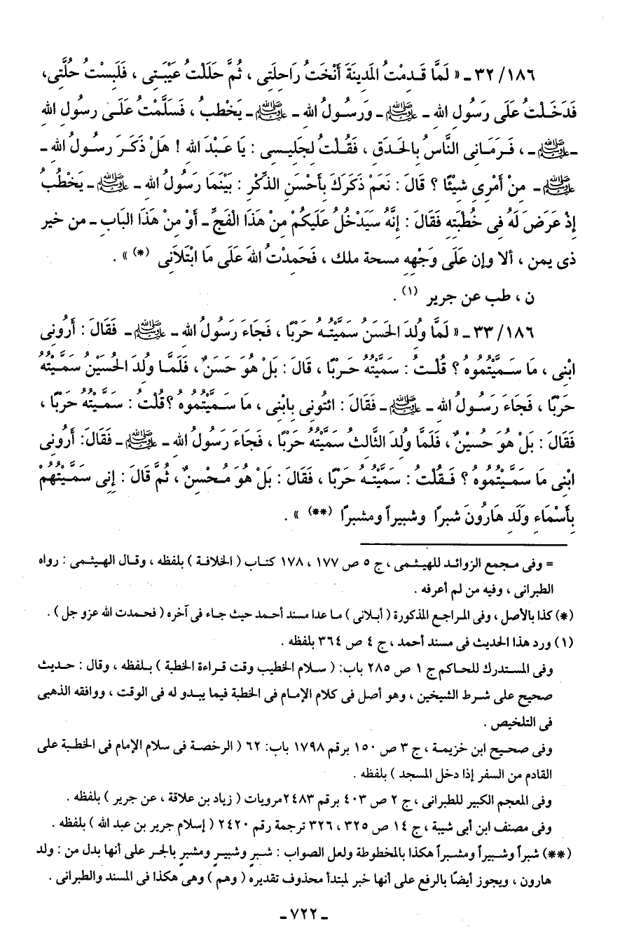 186/ 33 - "لمَّا وُلِدَ الحَسَنُ سَمَّيْتُهُ حَرْبًا، فَجَاءَ رَسُولُ اللهِ - صلى الله عليه وسلم - فَقَالَ: أَرُونِى ابْنِى، مَا سَمَّيْتُمُوهُ؟ قُلْتُ: سَمَّيْتُهُ حَرْبًا، قَالَ: بَلْ هُوَ حَسَنٌ، فَلَمَّا وُلِدَ الحُسَيْنُ سَمَّيْتُهُ حَربًا، فَجَاءَ رَسُولُ اللهِ - صلى الله عليه وسلم - فَقَالَ: ائتُونِى بِابْنِى، مَا سَمَّيْتُمُوهُ؟ قُلْتُ: سَمَّيْتُهُ حَرْبًا، فَقَالَ: بَلْ هُوَ حُسيْنٌ، فَلَمَّا وُلِدَ الثَّالِثُ سَمَّيْتُهُ حَرْبًا، فَجَاءَ رَسُولُ اللهِ - صلى الله عليه وسلم - فَقَالَ: أَرُونِى ابْنِى مَا سَمَّيْتُمُوهُ؟ فَقُلْتُ: سَمَّيْتُهُ حَرْبًا، فَقَالَ: بَلْ هُوَ مُحْسِنٌ، ثُمَّ قَالَ: إِنِى سَمَّيْتُهُمْ بِأَسْمَاءِ وَلَدِ هَارُونَ شبرًا وشبيرًا ومشبرًا (* *) ".