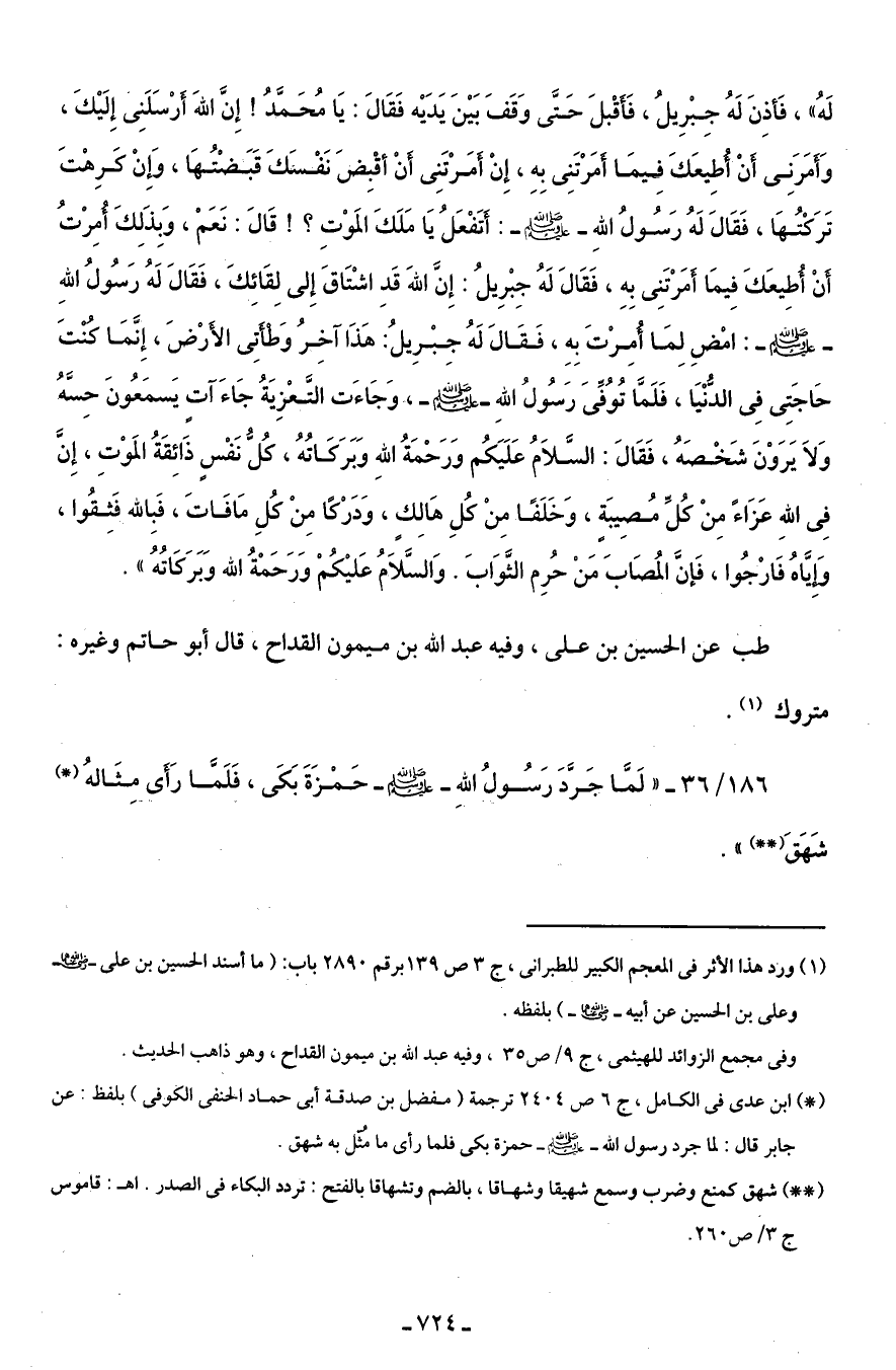 186/ 36 - "لمَّا جَرَّدَ رَسُولُ اللهِ - صلى الله عليه وسلم - حَمْزَةَ بَكَى، فَلَمَّا رَأَى مِثَالهُ (*) شَهَقَ (* *) ".