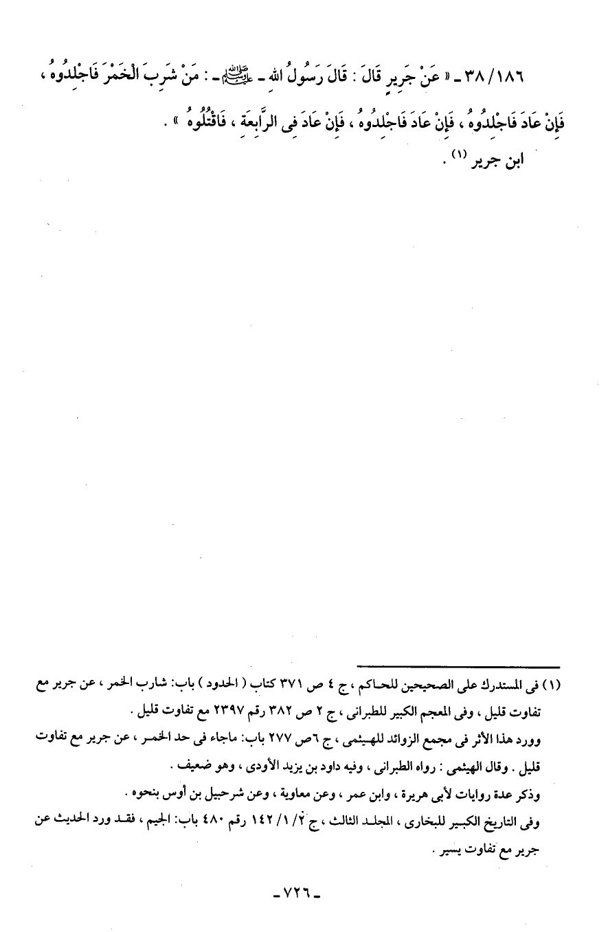 186/ 38 - "عَنْ جَرِيرٍ قَالَ: قَالَ رَسُولُ اللهِ - صلى الله عليه وسلم -: مَنْ شَرِبَ الْخَمْرَ فَاجْلِدُوهُ، فَإِنْ عَادَ فَاجْلِدُوهُ، فَإِنْ عَادَ فَاجْلِدُوهُ، فَإِنْ عَادَ فِي الرَّابِعَةِ، فَاقْتُلُوهُ".