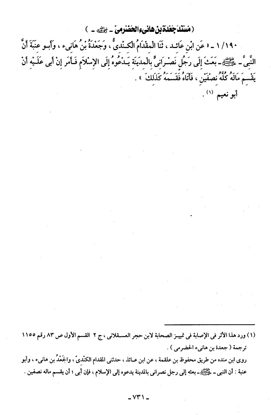 190/ 1 - " عَن ابْنِ عَائِد، ثَنَا الْمِقْدَامُ الْكِنْدِىُّ، وَجَعْدَةُ بْنُ هَانِئ، وَأَبو عِنَبَةَ أَنَّ النَّبِيَّ - صلى الله عليه وسلم - بَعَثَ إِلَى رَجُلٍ نَصْرَانِيٍّ بِالْمَدِينَةِ يَدْعُوهُ إِلَى الإِسْلَامِ فَأَمَر إِنْ أَبى عَلَيْهِ أَنْ يَقْسِمَ مَالَهُ كُلَّهُ نِصْفَيْنِ، فَأَتَاهُ فَقَسَمَهُ كَذَلِكَ".