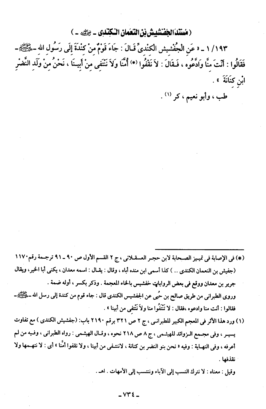 193/ 1 - " عَنِ الجُفْشِيش الْكِنْدِيِّ قَالَ: جَاءَ قَوْمٌ مِنْ كِنْدَةَ إِلَى رَسُولِ اللهِ - صلى الله عليه وسلم - فَقَالُوا: أَنْتَ مِنَّا وَادَّعُوه، فَقَالَ: لَا نَقْفُوا (*) أُمَّنا وَلَا نَنْتَفِى مِنْ أَبِينَا، نَحْنُ مِنْ وَلَدِ النَّضْرِ بْنِ كِنَانَةَ".