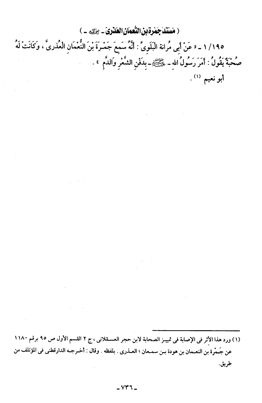 195/ 1 - " عَنْ أبِى مُرانة الْبَلَوِىَّ: أَنَّهُ سَمِعَ جَمْرَةَ بْنَ النُّعْمَانِ الْعُذرىَّ، وَكَانَتْ لَهُ صُحْبَةٌ يَقُولُ: أَمَرَ رَسُولُ اللهِ - صلى الله عليه وسلم - بِدَفْنِ الشَّعْرِ وَالدَّمِ".