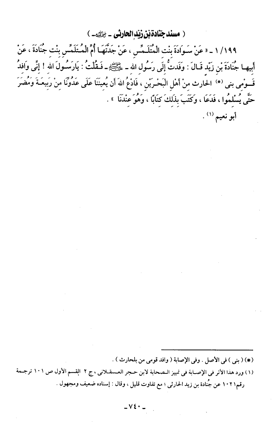 199/ 1 - " عَنْ سَوَادَةَ بِنْتِ الْمُتَلَمَّسِ، عَنْ جَدتَّهَا أُمِّ الْمُتَلَمَّسِ بِنْتِ جُنَادَةَ، عَنْ أبِيها جُنَادَةَ بْنِ زَيْدٍ قَالَ: وَفَدتُّ إِلَى رَسُولِ اللهِ - صلى الله عليه وسلم - فَقُلْتُ: يَا رَسُولَ اللهِ! إِنِّى وَافِدُ قَوْمِى بنى (*) الحارث مِنْ أَهْلِ البَحْرَيْنِ، فَادع اللهَ أَن يُعِينَنَا عَلَى عَدُوَّنَا مِنْ رَبِيعَةَ وَمُضَرَ حَتَّى يُسْلِمُوا، فَدَعَا، وَكتَبَ بِذَلِكَ كِتَابًا، وَهُوَ عِنْدَنَا".