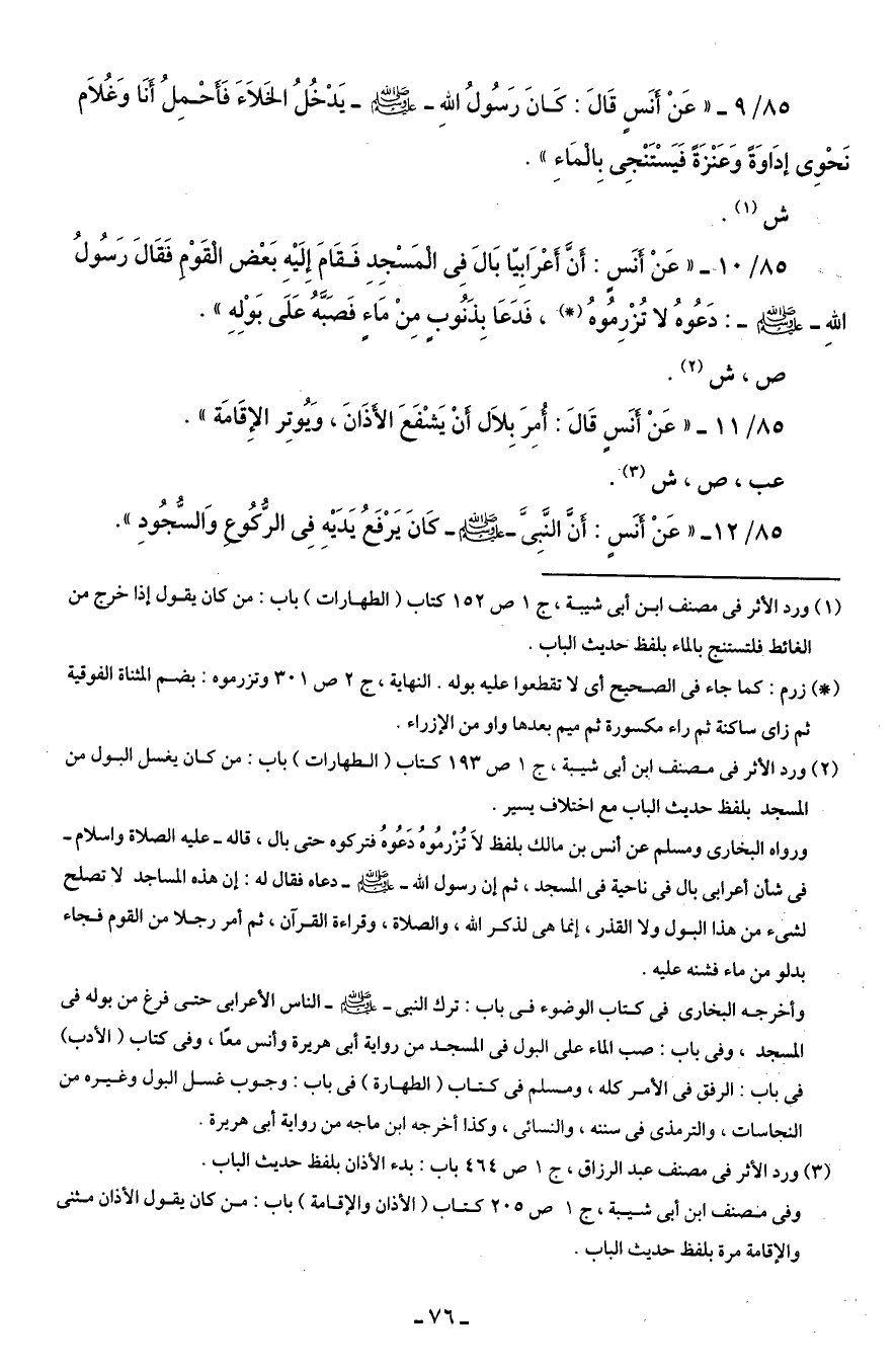 85/ 10 - "عَنْ أنَس: أَنَّ أَعْرَابِيّا بَالَ فِى المَسْجِدِ فَقَامَ إِلَيْهِ بَعْض القَوْم قَقَالَ رَسُولُ اللهِ - صلى الله عليه وسلم -: دَعُوهُ لا تُزْرِمُوهُ (*)، فَدَعَا بِذَنُوب مِنْ مَاء فَصَبَّهُ عَلَى بَوْلِهِ".