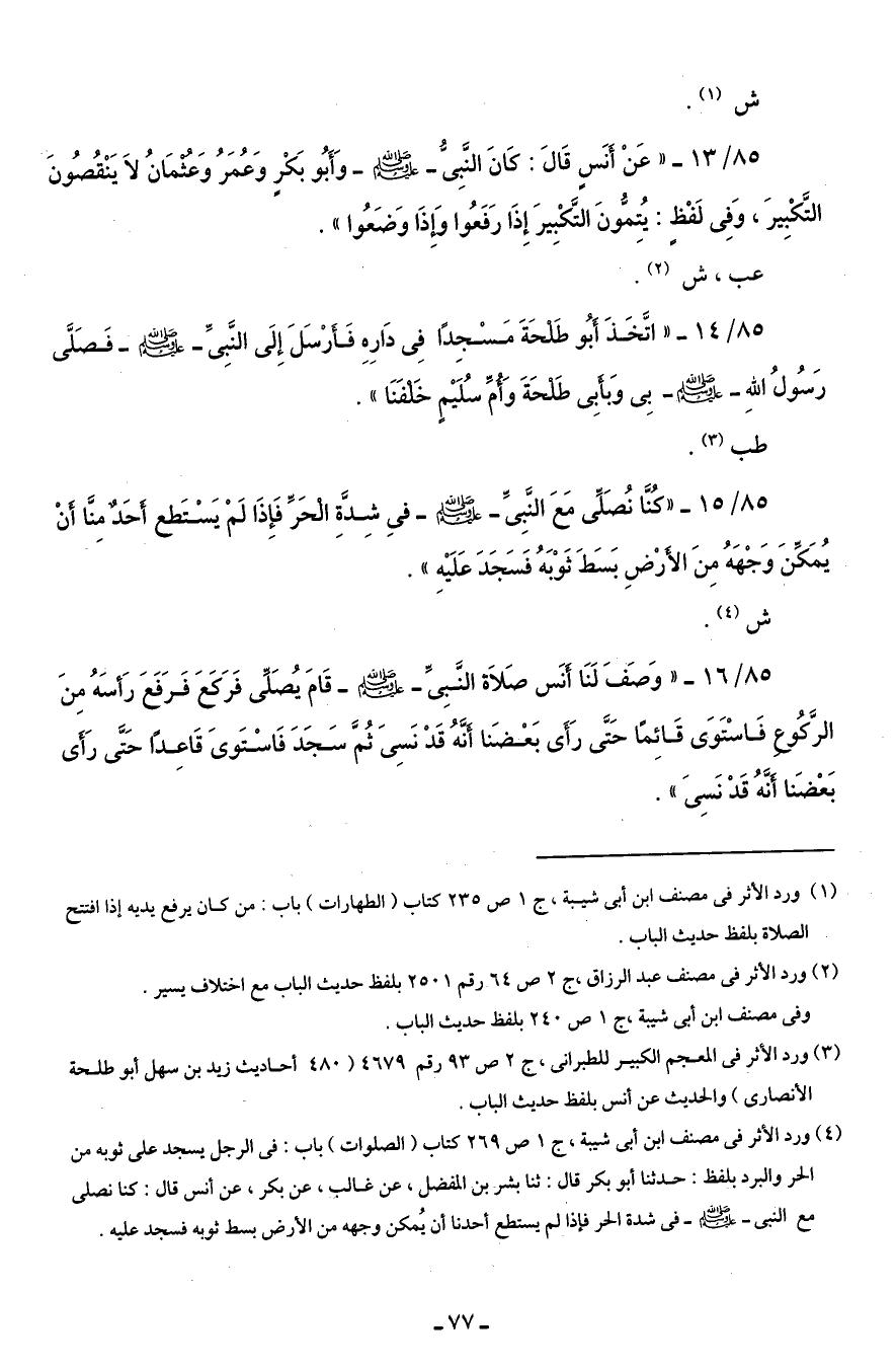 85/ 13 - "عَنْ أنَسٍ قَالَ: كَانَ النَّبِىُّ - صلى الله عليه وسلم - وَأَبُو بَكْر وَعُمَرُ وَعثمَانُ لاَ يَنْقُصُونَ التَّكْبِيرَ، وَفِى لَفْظ: يُتِمُّونَ التَّكْبِيرَ إِذَا رَفَعُوا وإذَا وَضَعُوا".