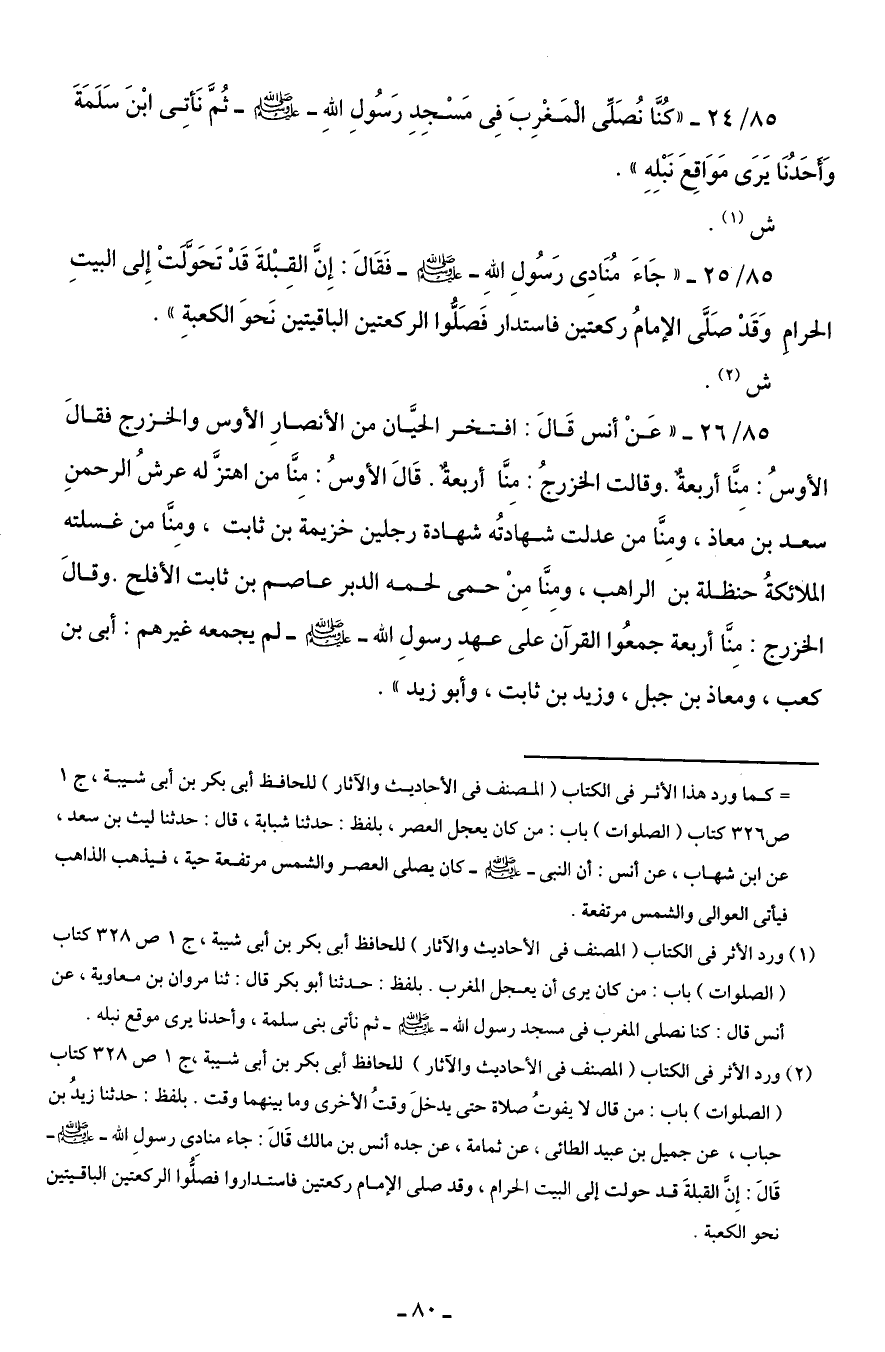 85/ 25 - " جَاءَ مُنَادِى رَسُولِ اللهِ - صلى الله عليه وسلم - فَقَالَ: إِنَّ القِبْلةَ قَدْ تَحَوَّلتْ إِلى البيتِ الحرام وَقَدْ صَلَّى الإمامُ ركعتين فاستدار فَصَلُّوا الركعتين الباقيتين نَحوَ الكعبةِ".