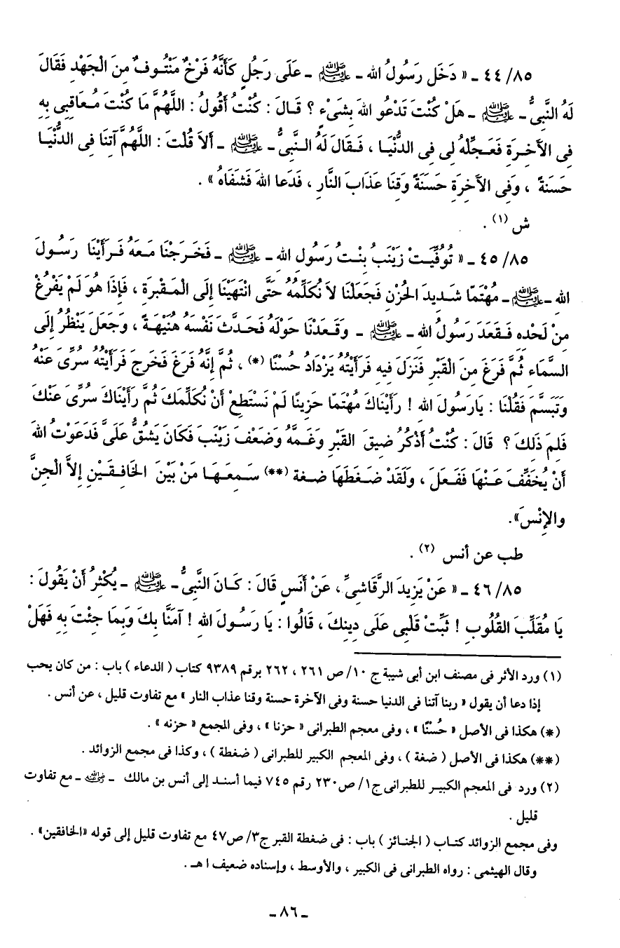 85/ 45 - " تُوُفِّيتْ زَيْنَبُ بنْتُ رَسُولِ اللهِ - صلى الله عليه وسلم - فَخَرَجْنَا مَعَهُ فَرَأَيْنَا رَسُولَ اللهِ - صلى الله عليه وسلم - مُهْتَمّا شَدِيدَ الحُزْنِ فَجَعَلنَا لاَ نُكَلِّمُهُ حَتَّى انْتَهَينَا إِلَى المَقْبرَةِ، فَإِذَا هُوَ لَمْ يَفْرُغْ مِنْ لَحْدِهِ فَقَعَدَ رَسُولُ اللهِ - صلى الله عليه وسلم - وَقَعَدْنَا حَوْلَهُ فَحَدَّثَ نَفْسَهُ هُنَيْهَةً، وَجَعَلَ يَنْظُرُ إِلَى السَّمَاءِ ثُمَّ فَرغَ مِنَ القَبْرِ فَنَزَلَ فيهِ فَرَأيْتُهُ يَزْدَادُ حُسْنًا (*)، ثُمَّ إِنَّهُ فَرغَ فَخَرجَ فَرَأيْتُهُ سُرِّى عَنْهُ وَتَبَسَّمَ فَقُلنَا: يَارَسُولَ اللهِ! رَأَيْنَاكَ مُهْتَمّا حَزِينًا لَمْ نَسْتَطِعْ أنْ نُكَلمَكَ ثُمَّ رَأَيْنَاكَ سُرِّىَ عَنْكَ فَلِمَ ذَلِكَ؟ قَالَ: كُنتُ أَذَكُرُ ضِيقَ القَبْرِ وَغَمَّهُ وَضَعْفَ زَيْنَبَ فَكَانَ يَشُق عَلَيَّ فَدَعَوْتُ اللهَ أنْ يُخَفِّفَ عَنْهَا فَفَعَلَ، وَلَقَدْ ضَغَطَهَا ضغة (* *) سَمِعَهَما مَنْ بَيْنَ الخَافِقَيْنِ إِلا الجِنَّ والإنْسَ".