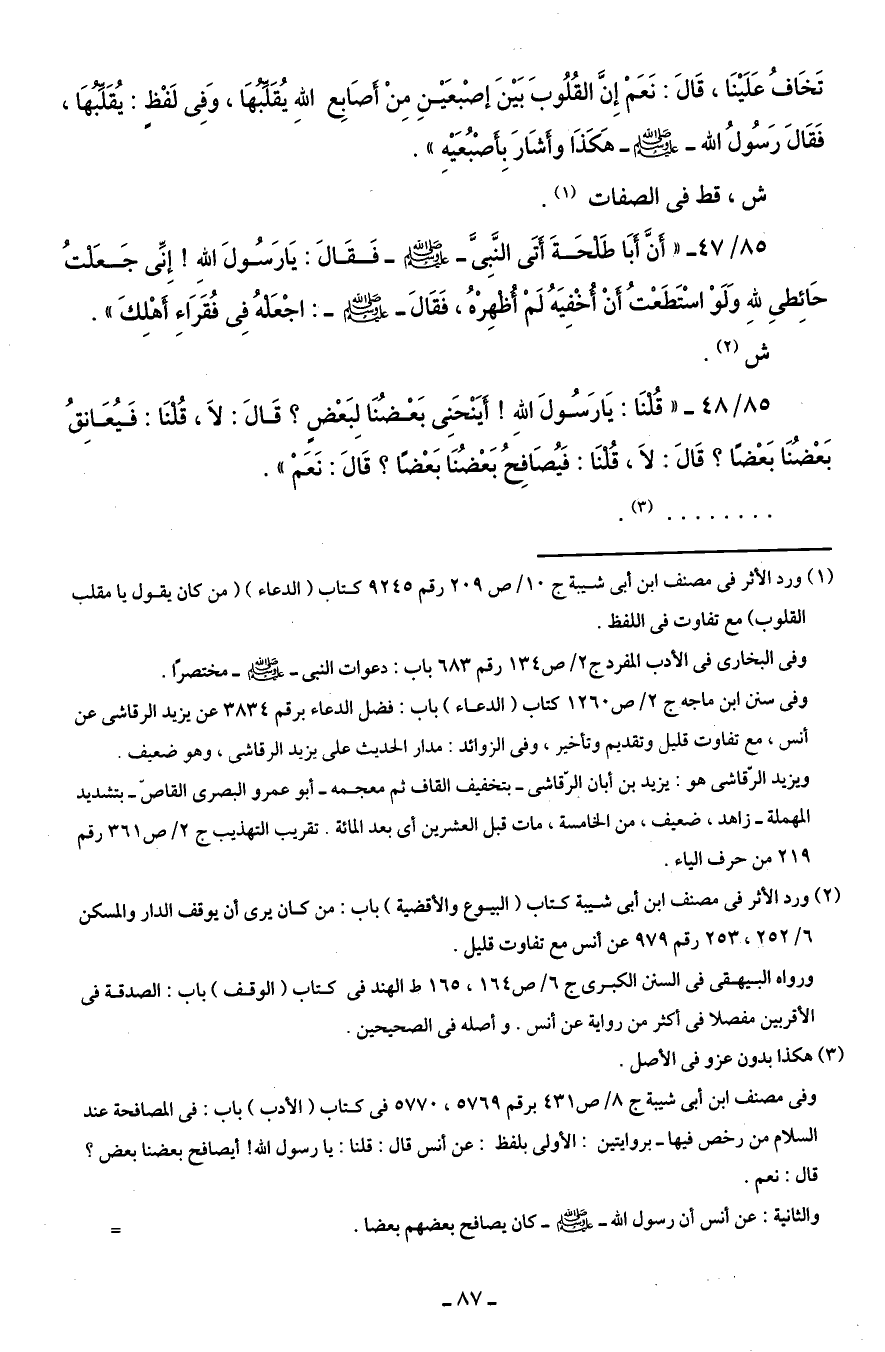 85/ 48 - " قُلنَا: يَارَسُولَ اللهِ! أيَنْحَنِى بَعْضُنَا لِبَعْض؟ قَالَ: لاَ، قُلنَا: فَيُعَانِقُ بَعْضُنَا بَعْضًا؟ قَالَ: لا، قُلنَا: فَيُصَافِحُ بَعْضُنَا بَعْضًا؟ قَالَ: نَعَمْ".