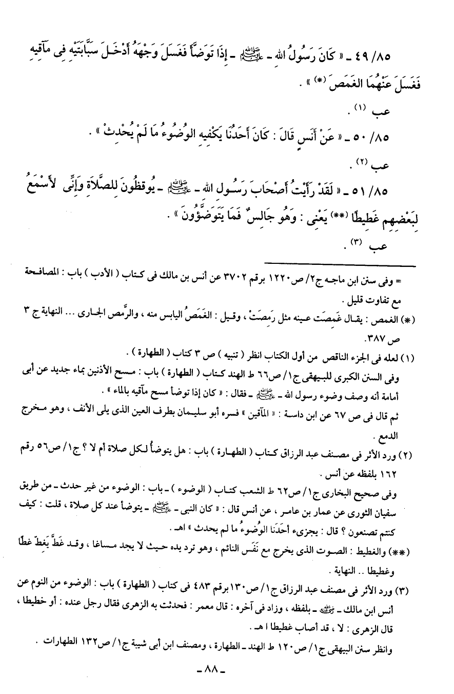 85/ 51 - "لَقَدْ رَأيْتُ أصْحَابَ رَسُولِ الله - صلى الله عليه وسلم - يُوقظُونَ لِلصَّلاَةِ وَإِنِّى لأسْمعُ لِبَعْضِهِم غَطِيطًا (* *) يَعْنِي: وَهُو جَالِسٌ فَمَا يَتَوَضَّؤُونَ".