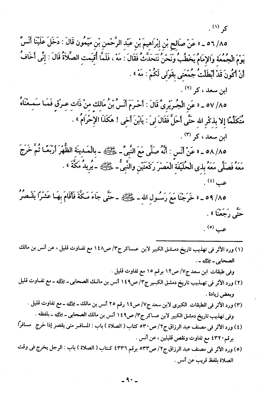 85/ 58 - "عَنْ أنَسٍ: أنَّهُ صَلَّى مَعَ النَّبِي - صلى الله عليه وسلم - بِالمَدِينَة الظُّهْرَ أرْبَعًا ثُمَّ خَرَجَ مَعَهُ فَصَلى مَعَهُ بِذِى الحُلَيْفَةِ العَصْرَ رَكْعَتَيْنِ والنَّبِىُّ - صلى الله عليه وسلم - يُرِيدُ مَكَّةَ! .