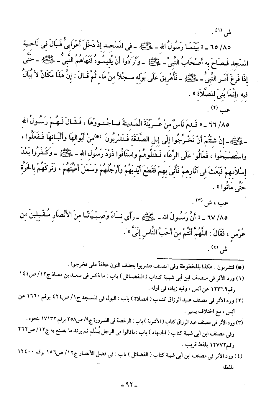 (¬2) ورد الأثر في مصنف عبد الرزاق كتاب (الصلاة) باب: البول في المسجد ج 1/ ص 424 برقم 1660 عن أنس، مع اختلاف يسير.