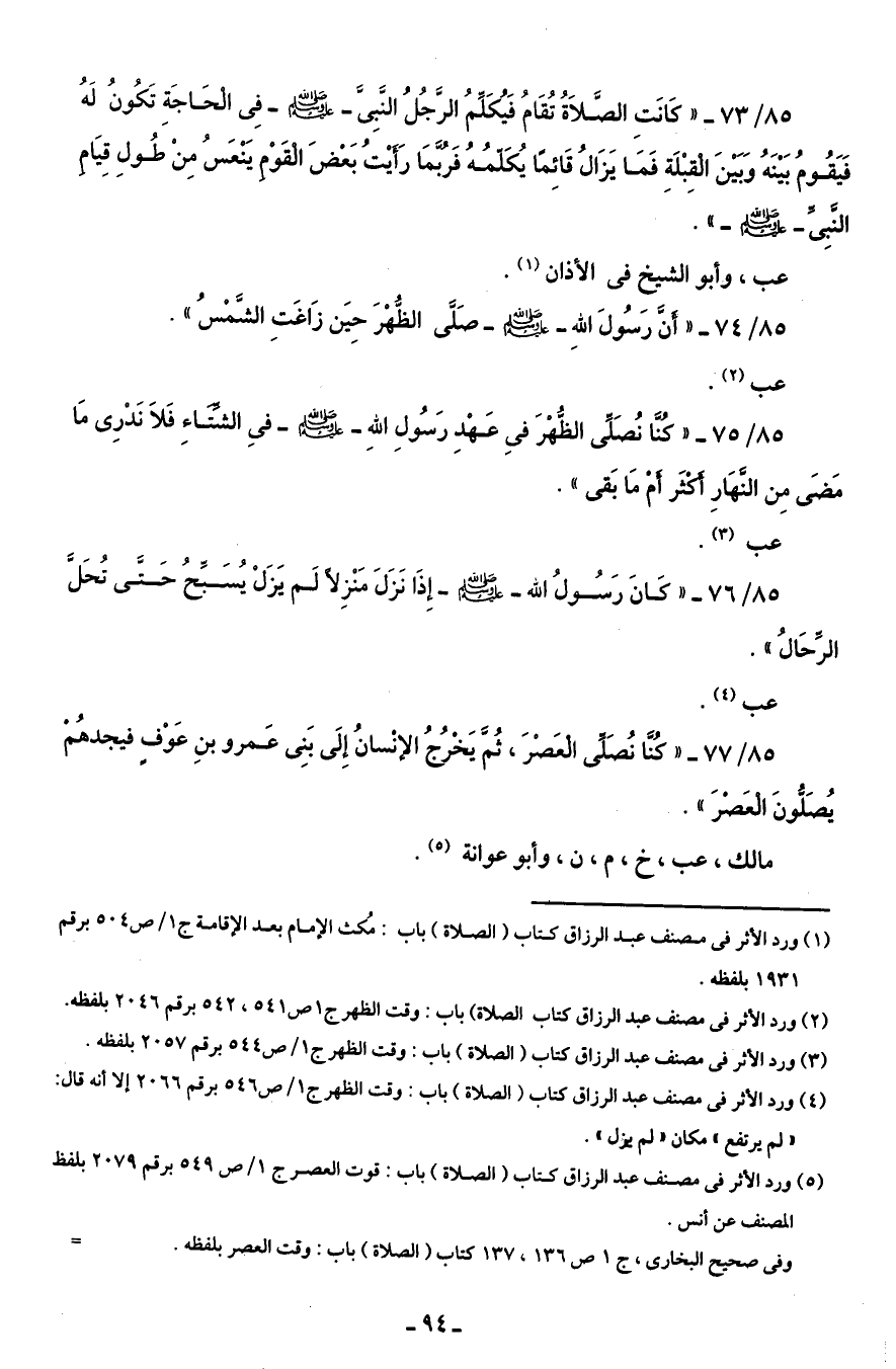 85/ 77 - " كُنَّا نُصَلِّى العَصْرَ، ثُمَّ يَخْرُجُ الإنْسانُ إِلَى بَنِى عَمرو بنِ عَوْف فيجدهُمْ يُصَلُّونَ العَصرَ".