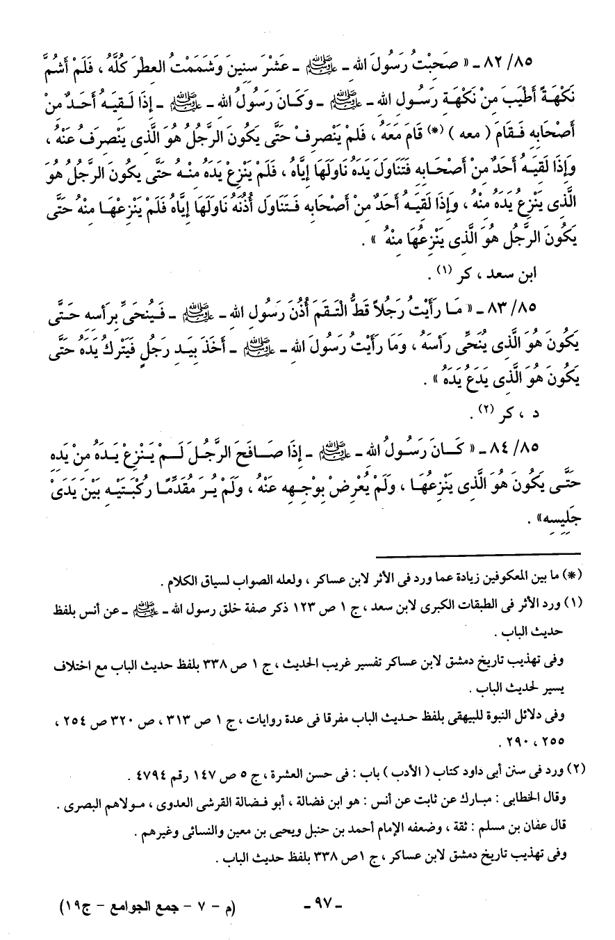 85/ 84 - "كانَ رَسُولُ اللهِ - صلى الله عليه وسلم - إِذَا صَافَحَ الرَّجلَ لَمْ يَنْزِعْ يَدَهُ مِنْ يَدِهِ حَتَّى يَكُونَ هُوَ الَّذِى يَنْزِعُهَا، وَلَمْ يُعْرِضْ بِوْجِهِه عَنْهُ، وَلَمْ يُرَ مُقَدِّمًا ركبَتَيْه بَيْنَ يَدَىْ جَلِيِسِه".