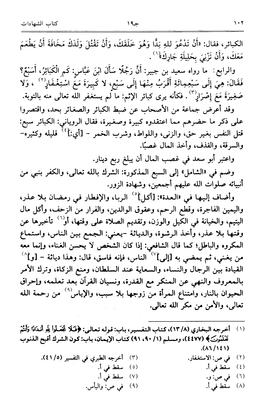 وضم في ((الشامل)) إلى السبع المذكورة: الشرك بالله تعالى، والكفر بنبي من أنبيائه صلوات الله عليهم أجمعين، وشهادة الزور.