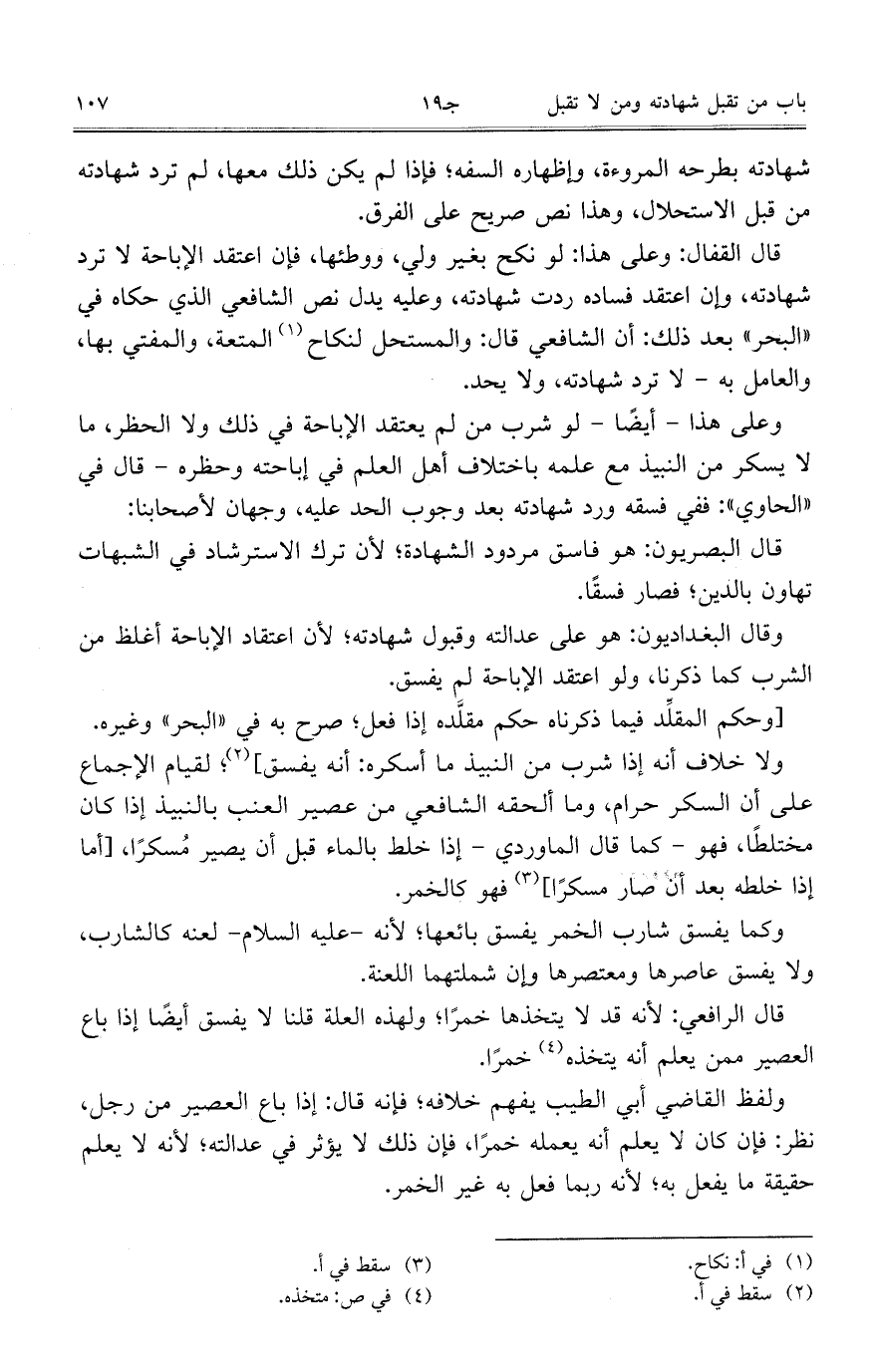 قال القفال: وعلى هذا: لو نكح بغير ولي، ووطئها، فإن اعتقد الإباحة لا ترد شهادته، وإن اعتقد فساده ردت شهادته، وعليه يدل نص الشافعي الذي حكاه في ((البحر)) بعد ذلك: أن الشافعي قال: والمستحل لنكاح المتعة، والمفتي بها، والعامل بها- لا ترد شهادته، ولا يحد.