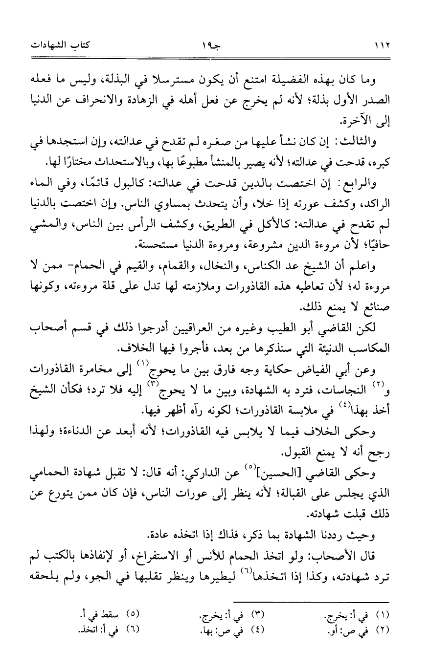 واعلم أن الشيخ عد الكناس، والنخال، والقمام، والقيم في الحمام- ممن لا مروءة له، لأن تعاطيه هذه القاذورات وملازمته لها تدل على قلة مروءته، وكونها صنائع لا يمنع ذلك.