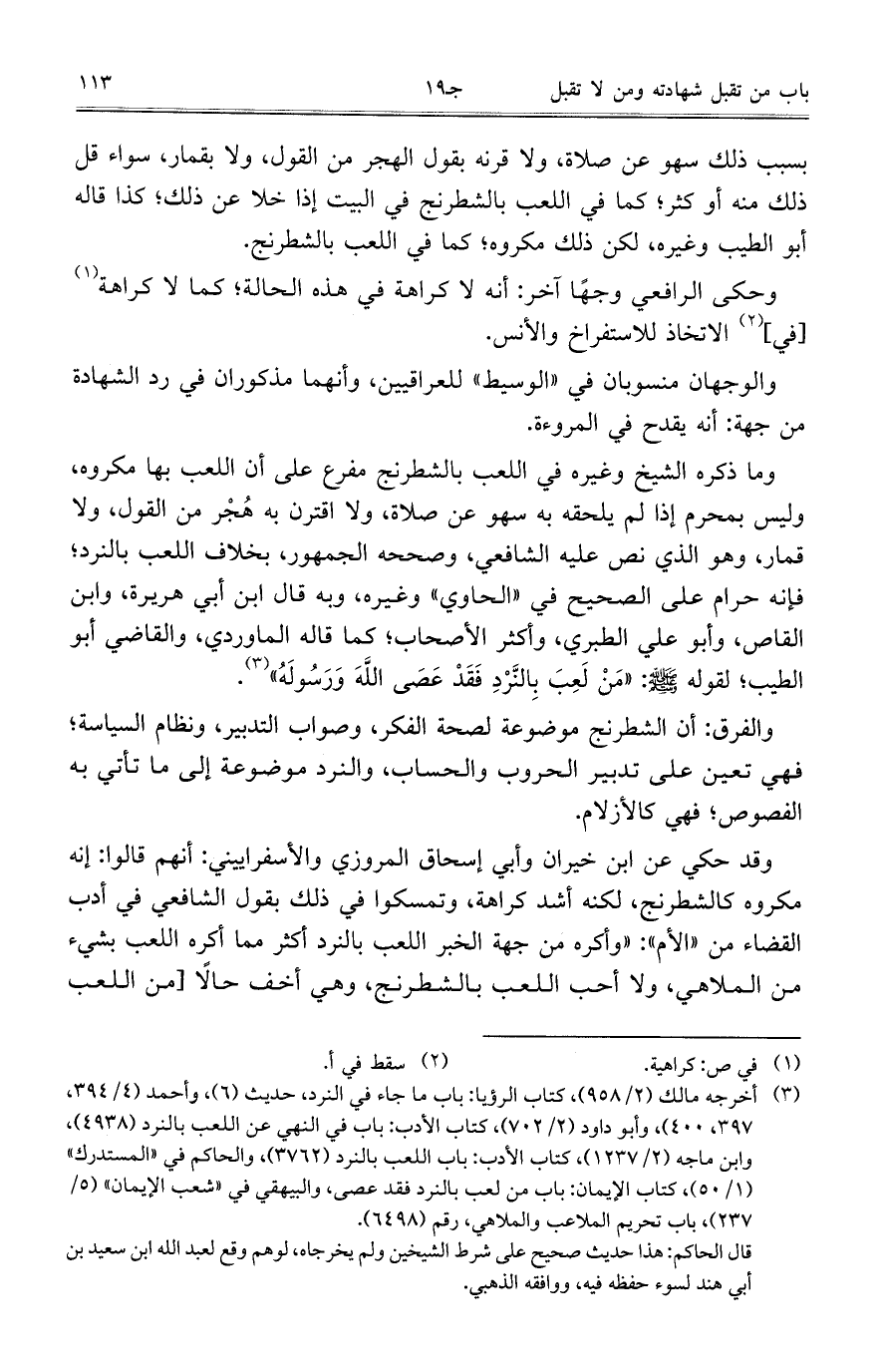 وما ذكره الشيخ وغيره في اللعب بالشطرنج مفرع على أن اللعب بها مكروه، وليس بمحرم إذا لم يلحقه به سهو عن صلاة، ولا اقتران به هجر من القول، ولا قمار، وهو الذي نص عليه الشافعي، وصححه الجمهور، بخلاف اللعب بالنرد، فإنه حرام على الصحيح في ((الحاوي)) وغيره، وبه قال ابن أبي هريرة، وابن القاص، وأبو علي الطبري، وأكثر الأصحاب، كما قاله الماوردي، والقاضي أبو الطيب، لقوله صلّى الله عليه وسلّم: ((من لعب بالنرد فقد عصى الله ورسوله)).