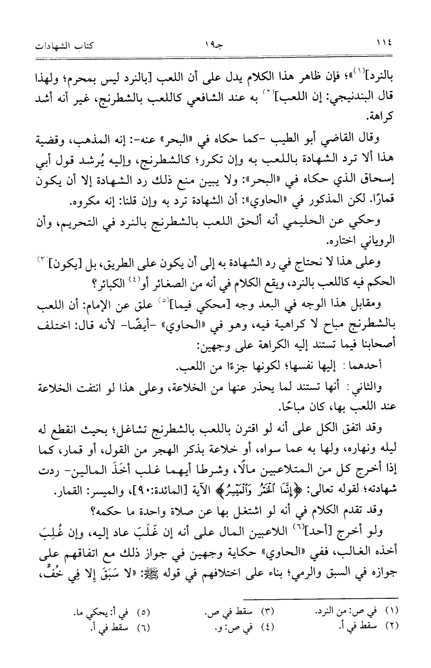 وقال القاضي أبو الطيب- كما حكاه في ((البحر)) عنه-: إنه المذهب، وقضية هذا ألا ترد الشهادة باللعب به وإن تكرر، كالشطرنج، وإليه يرشد قول أبي إسحاق الذي حكاه في ((البحر)): ولا يبين منع ذلك رد الشهادة إلا أن يكون قمارًا. لكن المذكور في ((الحاوي)): أن الشهادة ترد به وإن قلنا: إنه مكروه.