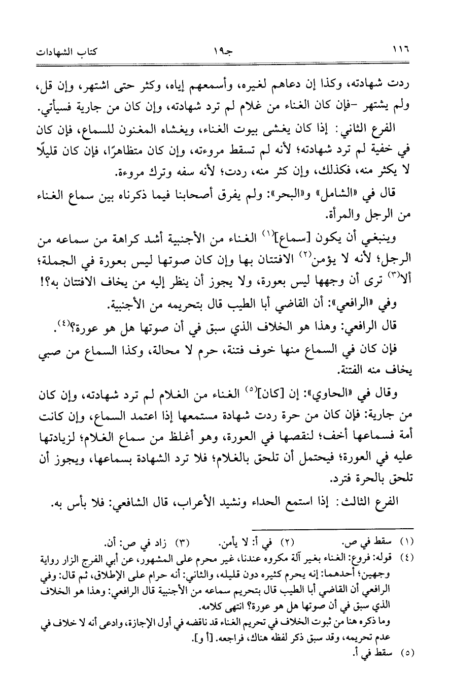 الفرع الثاني: إذا كان يغشى بيوت الغناء، ويغشاه المغنون للسماع، فإن كان في خفية لم ترد شهادته، لأنه لم تسقط مروءته، وإن كان متظاهرًا، فإن كان قليلًا لا يكثر منه، فكذلك، وإن كثر منه، ردت، لأنه سفه وترك مروءة.