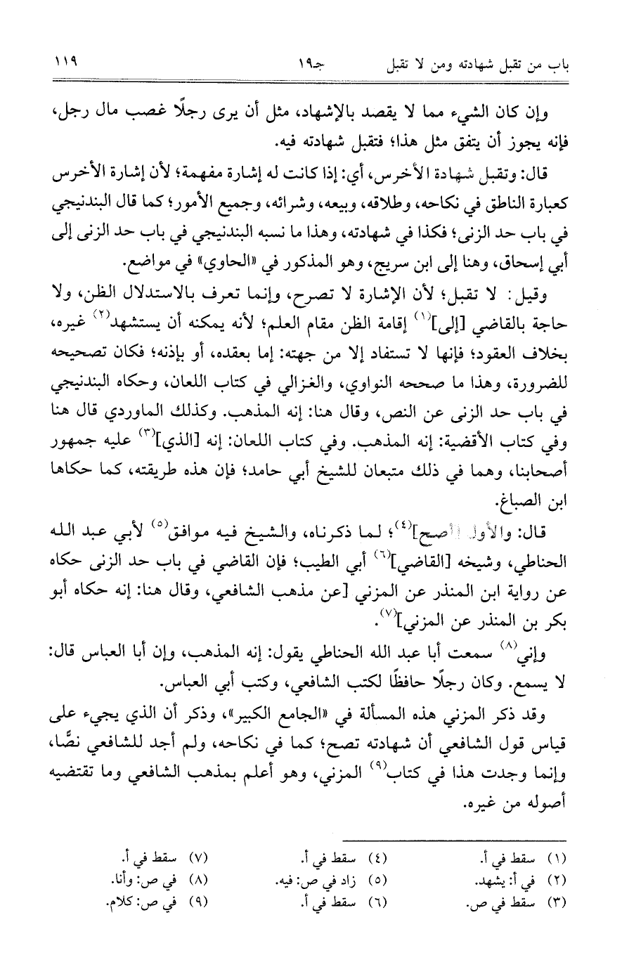 وقيل: لا تقبل، لأن الإشارة لا تصرح، وإنما تعرف بالاستدلال الظن، ولا حاجة بالقاضي [إلى] إقامة الظن مقام العلم، لأنه يمكنه أن يستشهد غيره، بخلاف العقود، فإنها لا تستفاد إلا من جهته: إما بعقده، أو بإذنه، فكان تصحيحه للضرورة، وهذا ما صححه النواوي، والغزالي في كتاب اللعان، وحاكه البندنيجي في باب حد الزنى عن النص، وقال هنا: إنه المذهب. وكذلك الماوردي قال هنا وفي كتاب الأقضية: إنه المذهب. وفي كتاب اللعان: إنه [الذي] عليه جمهور أصحابنا، وهما في ذلك متبعان للشيخ أبي حامد، فإن هذه طريقته، كما حكاها ابن الصباغ.