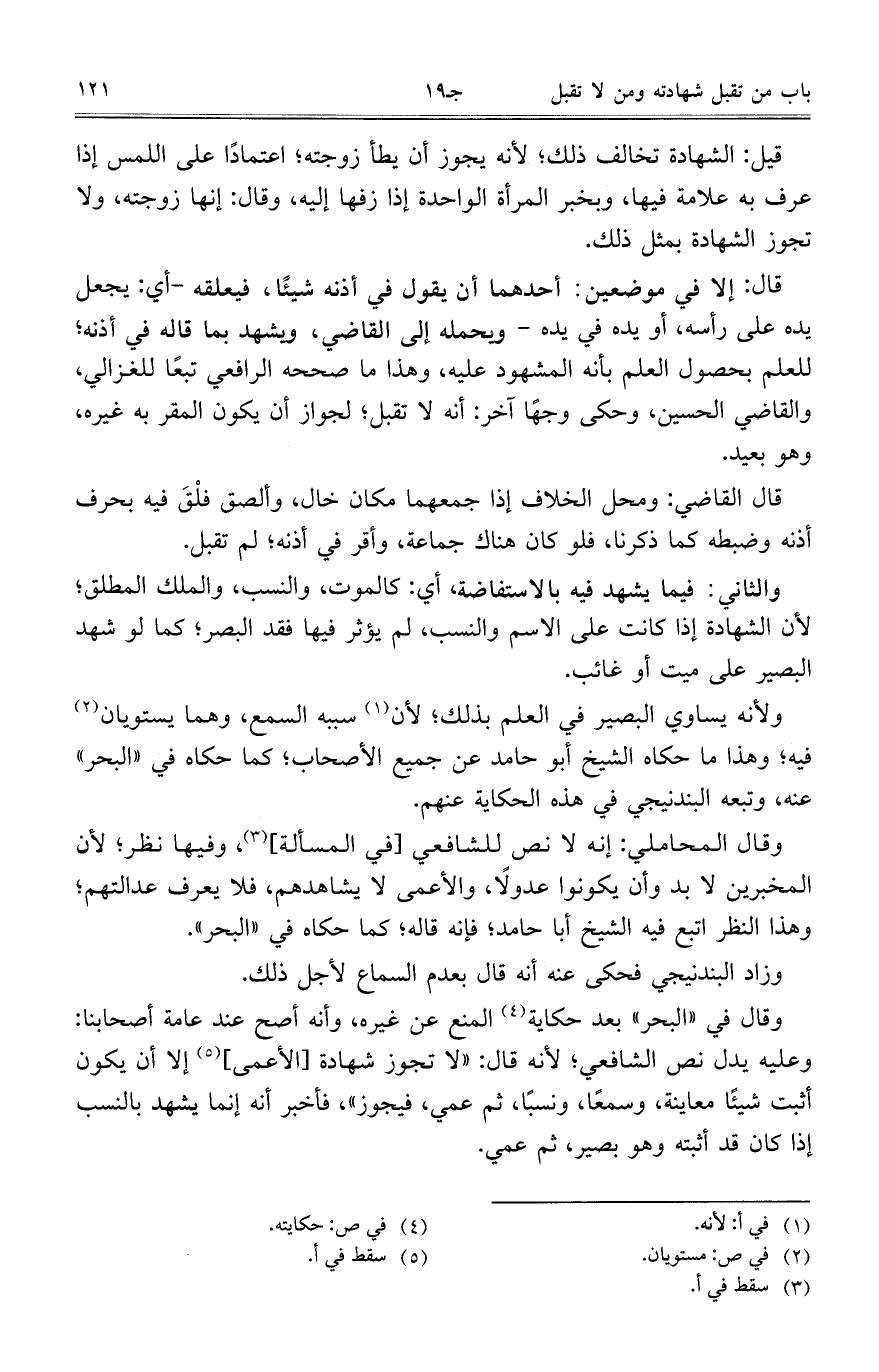 وقال المحاملي: إنه لا نص للشافعي [في المسألة]، وفيها نظر، لأن المخبرين لابد وأن يكونوا عدولًا، والأعمى لا يشاهدهم، فلا يعرف عدالتهم، وهذا النظر اتبع فيه الشيخ أبا حامد، فإنه قاله، كما حكاه في ((البحر)).