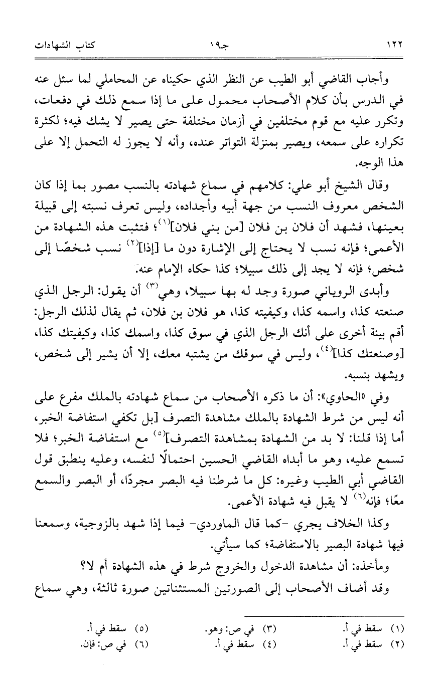 وقال الشيخ أبو علي: كلامهم في سماع شهادته بالنسب مصور بما إذا كان الشخص معروف النسب من جهة أبيه وأجداده، وليس تعرف نسبته إلى قبيلة بعينها، فشهد أن فلان بن فلان [من بني فلان]، فتثبت هذه الشهادة من الأعمى، فإنه نسب لا يحتاج إلى الإشارة دون ما [إذا] نسب شخصًا إلى شخص، فإنه لا يجد إلى ذلك سبيلًا، كذا حكاه الإمام عنه.