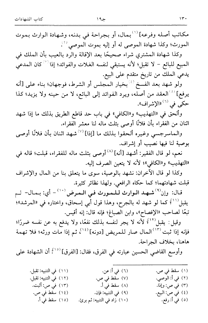 مكاتب أصله وفرع] بمال، أو بجراحة في بدنه، وشهادة الوارث بموت المورث، وكذا شهادة الموصي له أو إليه بموت الموصي.