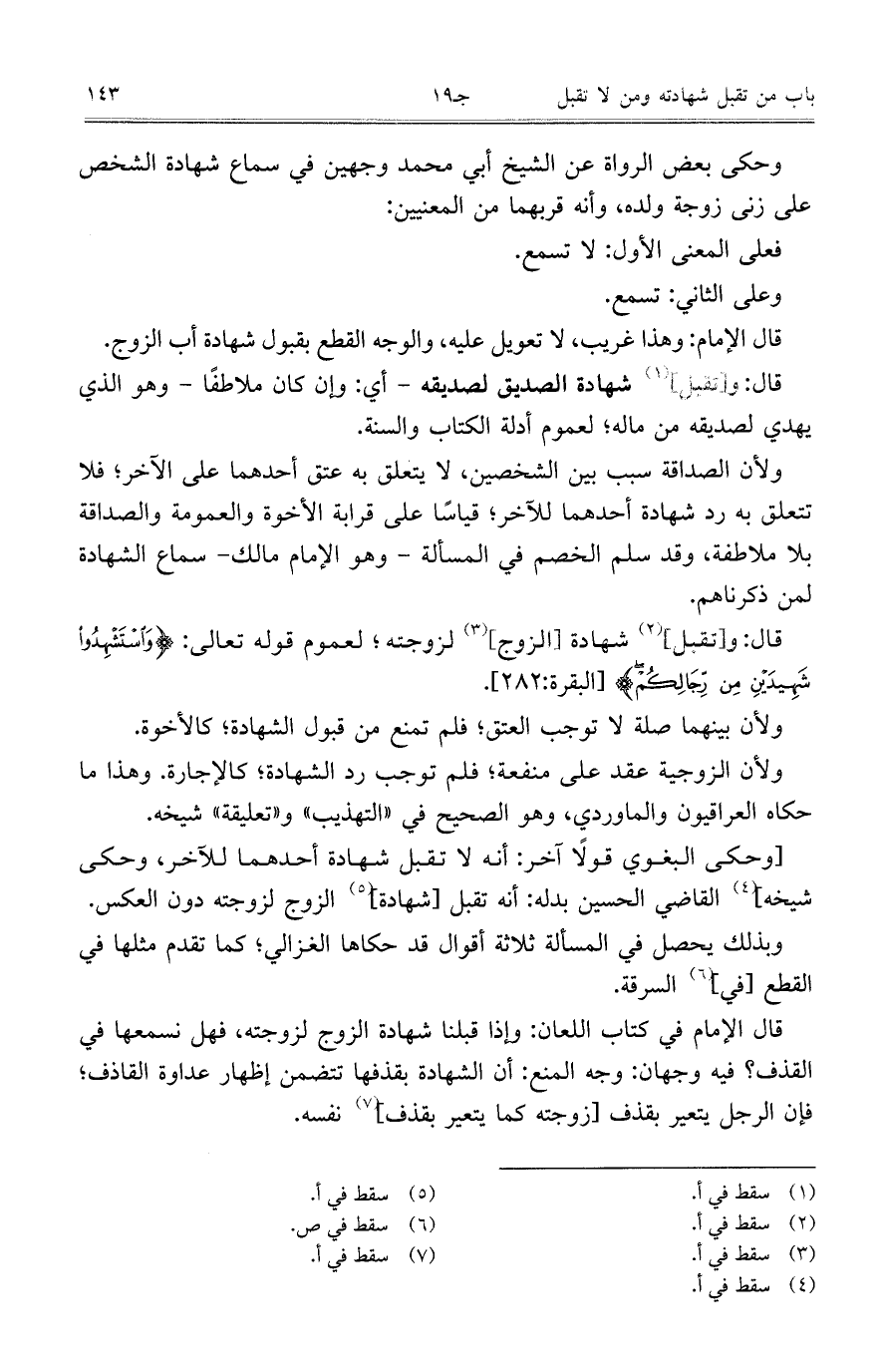 وحكى بعض الرواة عن الشيخ أبي محمد وجهين في سماع شهادة الشخص على زنى زوجة ولده، وأنه قربهما من المعنيين: