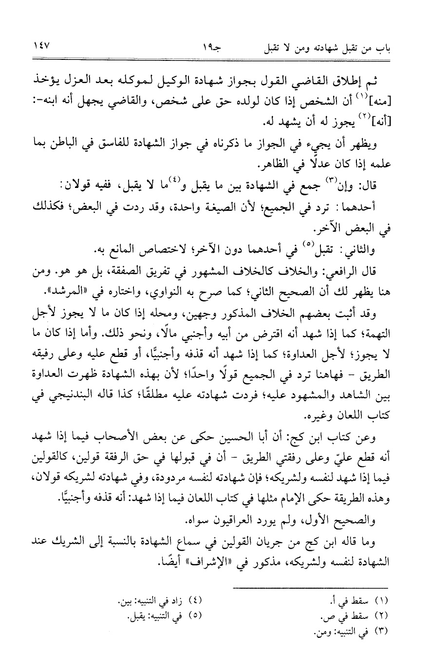 وقد أثبت بعضهم الخلاف المذكور وجهين، ومحله إذا كان ما لا يجوز لأجل التهمة، كما إذا شهد أنه اقترض من أبيه وأجنبي مالًا، ونحو ذلك. وأما إذا كان ما لا يجوز، لأجل العداوة، كما إذا شهد أنه قذفه وأجنبيًا، أو قطع عليه وعلى رفيقه الطريق- فها هنا ترد في الجميع قولًا واحدًا، لأن بهذه الشهادة ظهرت العداوة بين الشاهد والمشهود عليه، فردت شهادته عليه مطلقًا، كذا قاله البندنيجي في كتاب اللعان وغيره.
