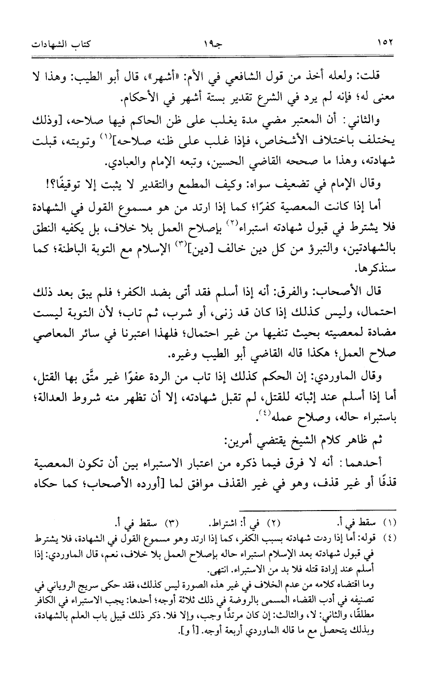 أما إذا كانت المعصية كفرًا، كما إذا ارتد من هو مسموع القول في الشهادة فلا يشترط في قبول شهادته استبراء بإصلاح العمل بلا خلاف، بل يكفيه النطق بالشهادتين، والتبرؤ من كل دين خالف [دين] الإسلام مع التوبة الباطنة، كما سنذكرها.