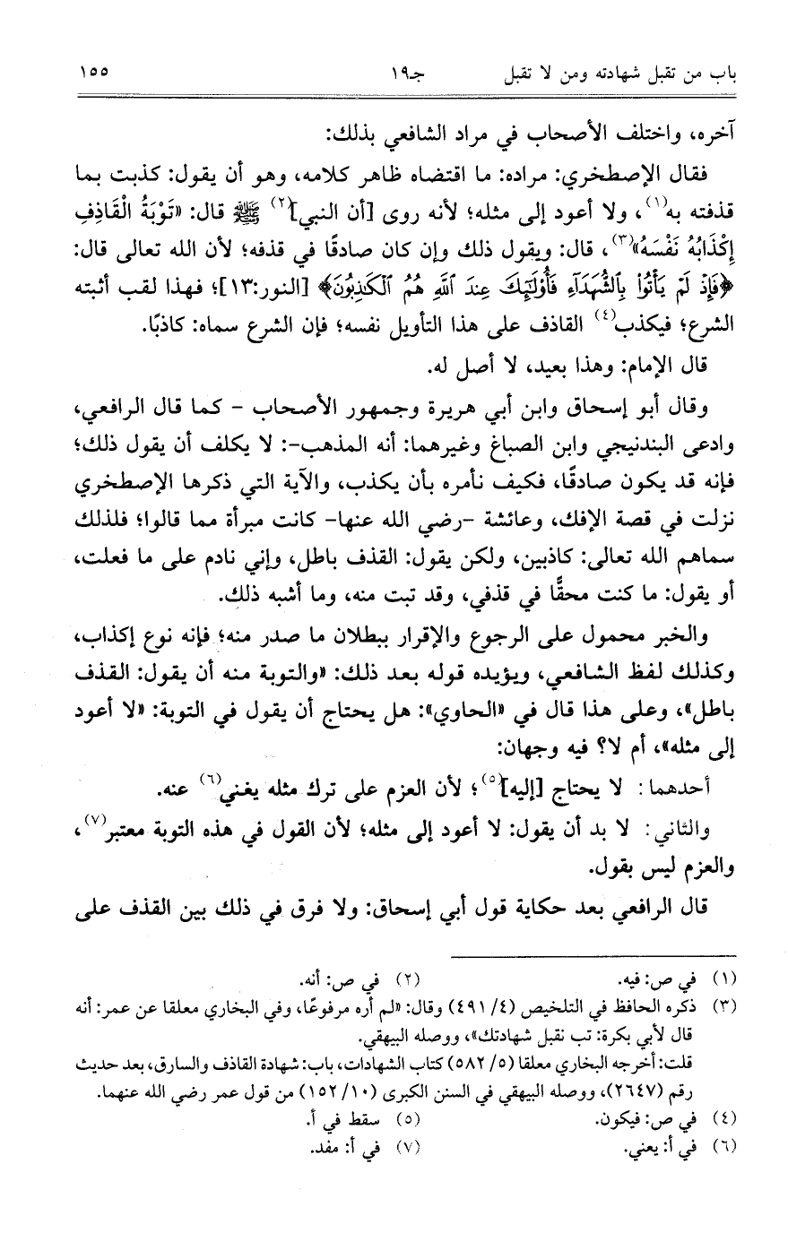 وقال أبو إسحاق وابن هريرة وجمهور الأصحاب- كما قال الرافعي، وادعى البندنيجي وابن الصباغ وغيرهما: أنه المذهب-: لا يكلف أن يقول ذلك، فإنه قد يكون صادقًا، فكيف نأمره بأن يكذب، والآية التي ذكرها الإصطخري نزلت في قصة الإفك، وعائشة- رضي الله عنها- كانت مبرأة مما قالوا، فلذلك سماهم الله تعال: كاذبين، ولكن يقول: القذف باطل، وإني نادم على ما فعلت، أو يقول: ما كنت محقًا في قذفي، وقد تبت منه، وما أشبه ذلك.