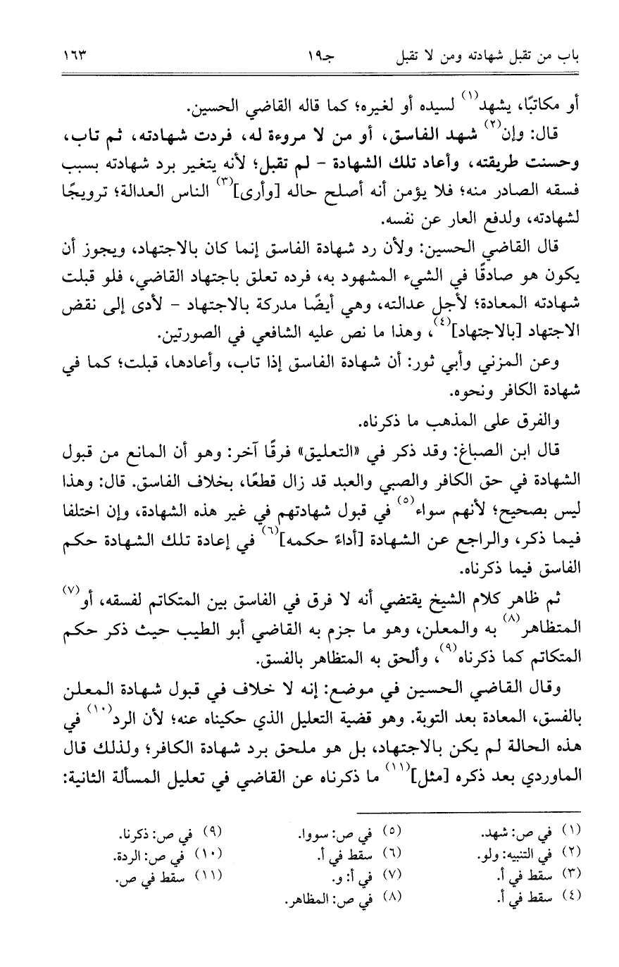 قال ابن الصباغ: وقد ذكر في ((التعليق)) فرقًا آخر: وهو أن المانع من قبول الشهادة في حق الكافر والصبي والعبد قد زال قطعًا، بخلاف الفاسق. قال: وهذا ليس بصحيح، لأنهم سواء في قبول شهادتهم في غير هذه الشهادة، وإن اختلفا فيما ذكر، والراجح عن الشهادة [أداءً حكمه] في إعادة تلك الشاهدة حكم الفاسق فيما ذكرناه.