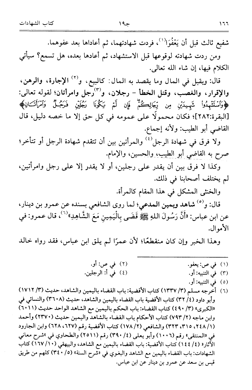 قال: وشاهد ويمين المدعي، لما روى الشافعي بسنده عن عمرو بن دينار، عن ابن عباس: ((أن رسول الله صلّى الله عليه وسلّم قضى باليمين مع الشاهد))، قال عمرو: في الأموال.