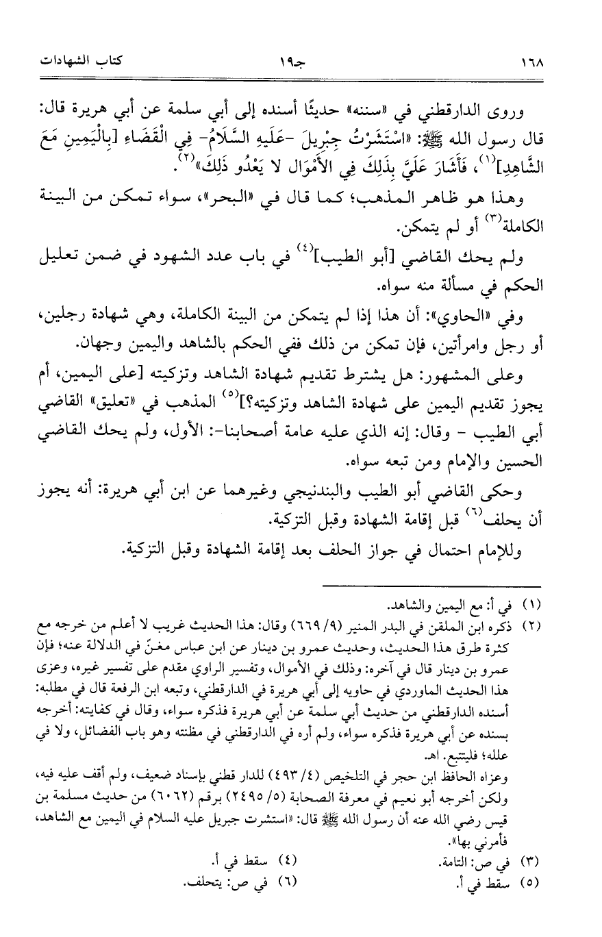 وروى الدارقطني في ((سننه)) حديثًا أسنده إلى أبي سلمة عن أبي هريرة قال: قال رسول الله صلّى الله عليه وسلّم: ((استشرت جبريل- عليه السلام- في القضاء [باليمين مع الشاهد]، فأشار علي بذلك في الأموال لا يعدو يذلك)).