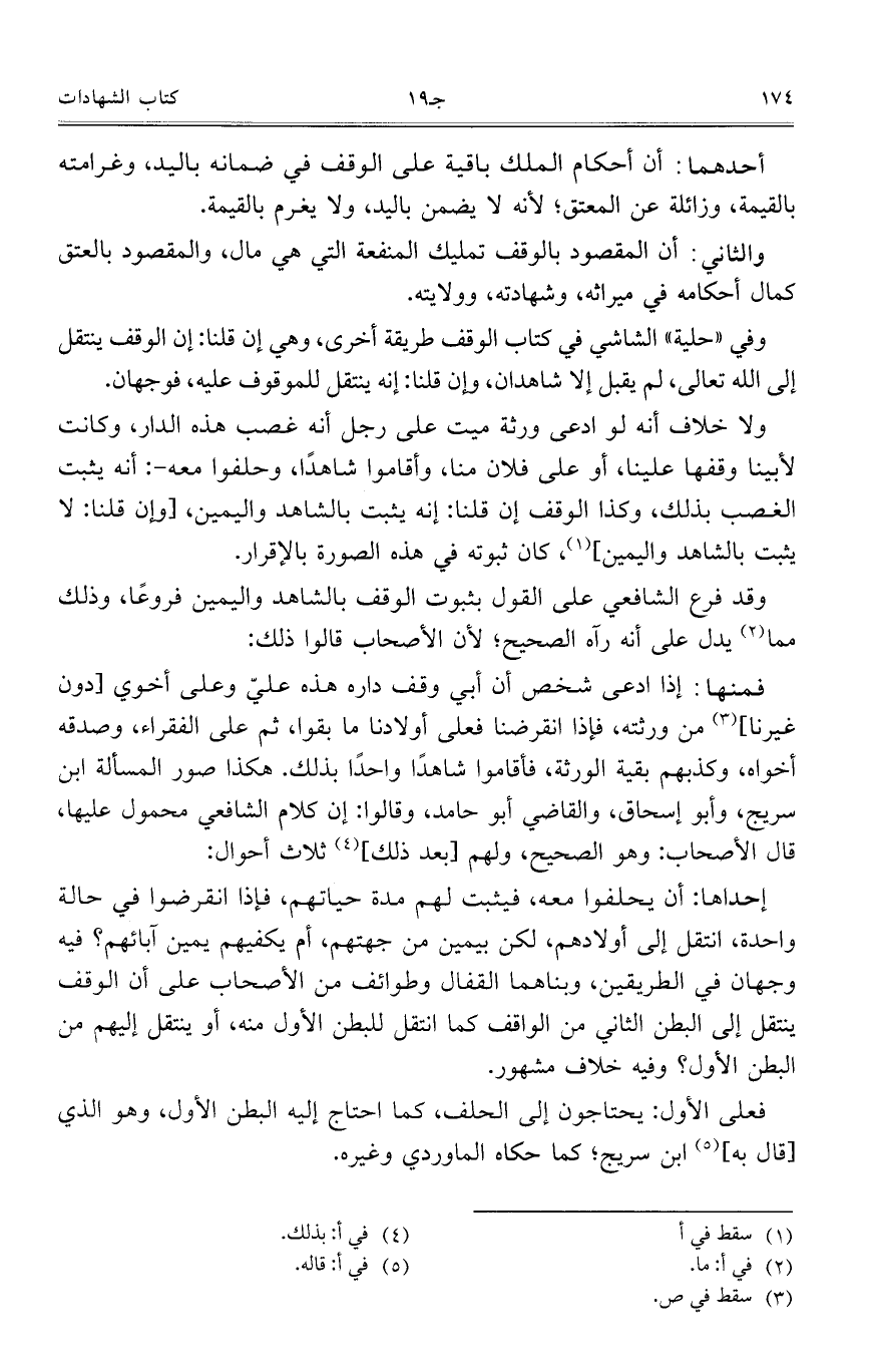 وفي ((حلية)) الشاشي في كتاب الوقف طريقة أخرى، وهي إن قلنا: إن الوقف ينتقل إلى الله تعالى، لم يقبل إلا شاهدان، وإن قلنا: إنه ينتقل للموقوف عليه، فوجهان.