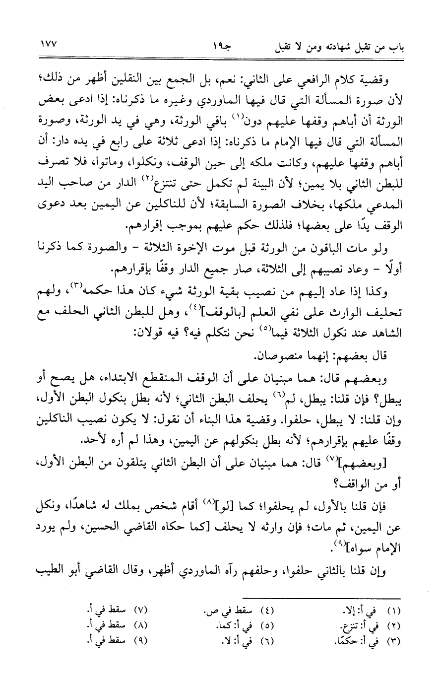وبعضهم قال: هما مبنيان على أن الوقف المنقطع الابتداء، هل يصح أو يبطل؟ فإن قلنا: يبطل، لم يحلف البطن الثاني، لأنه بطل بنكول البطن الأول، وإن قلنا: لا يبطل، حلفوا. وقضية هذا البناء أن نقول: لا يكون نصيب الناكلين وقفًا عليهم بإقرارهم، لأنه بطل بنكولهم عن اليمين، وهذا لم أره لأحد.