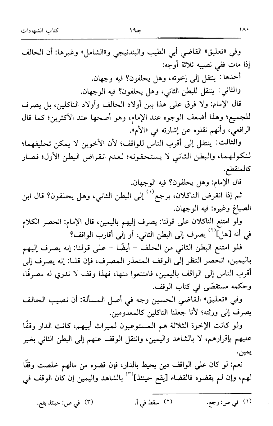 وفي ((تعليق)) القاضي أبي الطيب والبندنيجي و ((الشامل)) وغيرهما: أن الحالف إذا مات ففي نصيبه ثلاثة أوجه:
