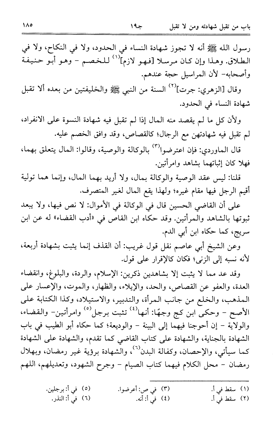 رسول الله صلّى الله عليه وسلّم أنه لا تجوز شهادة النساء في الحدود، ولا في النكاح، ولا في الطلاق. وهذا وإن كان مرسلًا [فهو لازم] للخصم- وهو أبو حنيفة وأصحابنه- لأن المراسيل حجة عندهم.