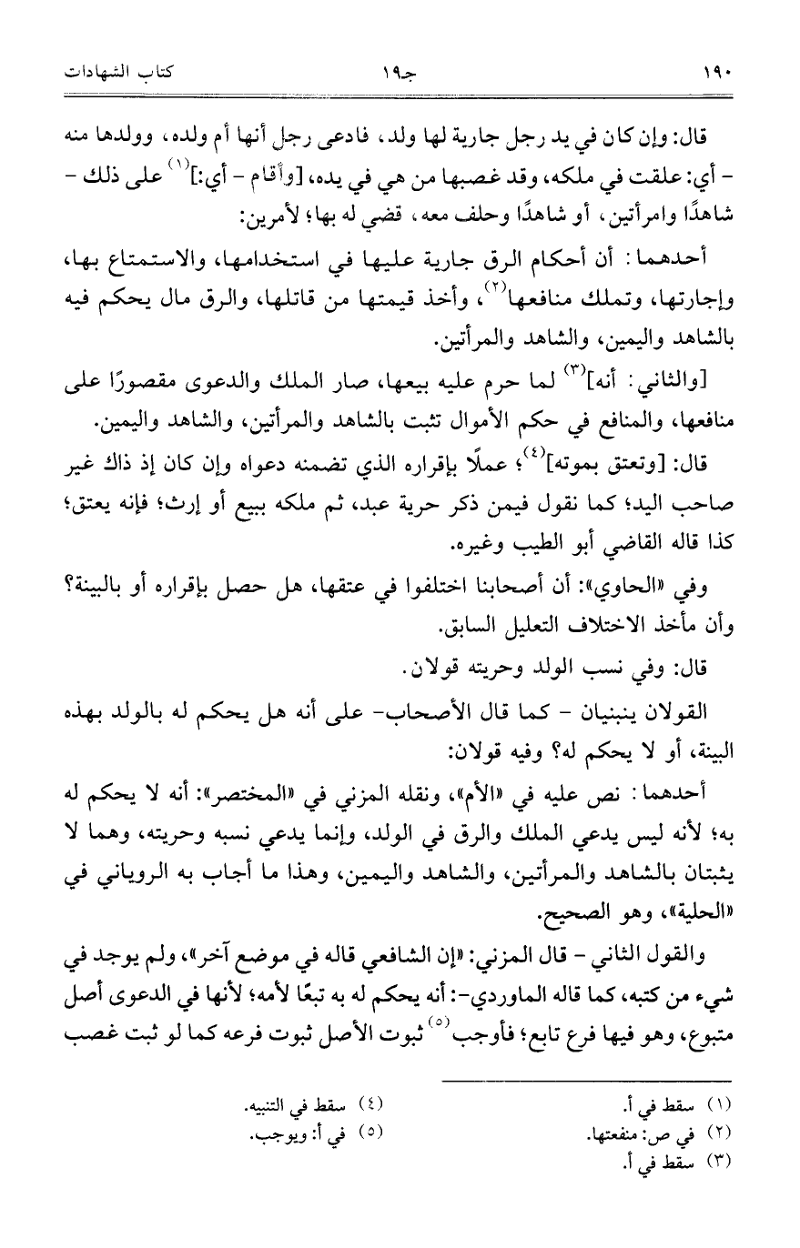 قال: وإن كان في يد رجل جارية لها ولد، فادعى رجل أنها أم ولده، وولدها منه- أي: علقت في ملكه، وقد غصبها من هي في يده، [وأقام-أي:] على ذلك- شاهدًا وامرأتين، أو شاهدًا وحلف معه، قضي له بها، لأمرين: