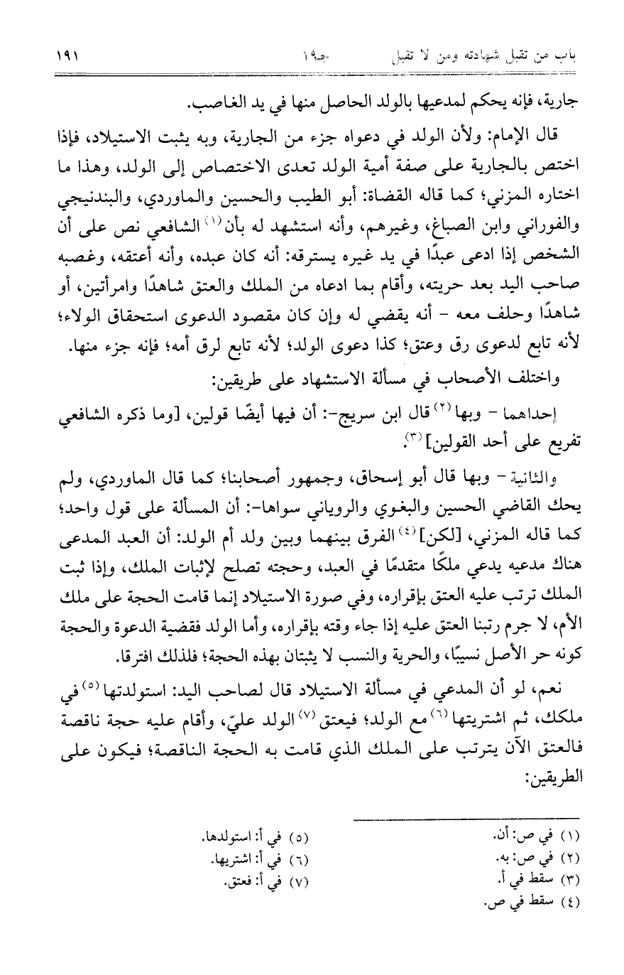 قال الإمام: ولأن الولد في دعواه جزء من الجارية، وبه يثبت الاستيلاد، فإذا اختص بالجارية على صفة أمية الولد تعدى الاختصاص إلى الولد، وهذا ما اختاره المزني، كما قاله القضاة: أبو الطيب والحسين والماوردي، والبندنيجي والفوراني وابن الصباغ، وغيرهم، وأنه استشهد له بأن الشافعي نص على أن الشخص إذا ادعى عبدًا في يد غيره يسترقه: أنه كان عبده، وأنه أعتقه، وغصبه صاحب اليد بعد حريته، وأقام بما ادعاه من الملك والعتق شاهدًا وامرأتين، أو شاهدًا وحلف معه- أنه يقضي له وإن كان مقصود الدعوى استحقاق الولاء، لأنه تابع لدعوى رق وعتق، كذا دعوى الولد، لأنه تابع لرق أمه، فإنه جزء منها.