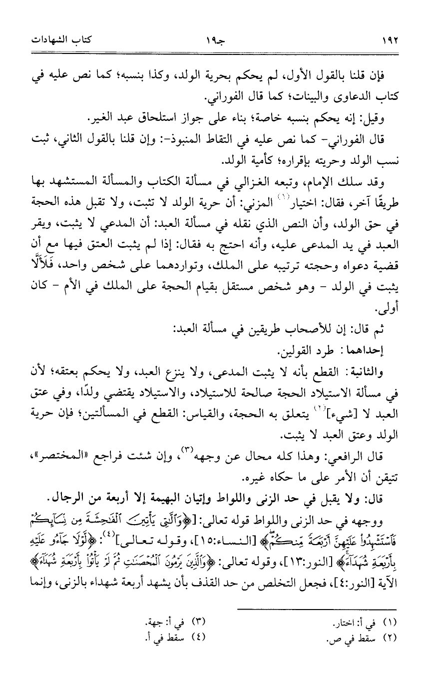 وقد سلك الإمام، وتبعه الغزالي في مسألة الكتاب والمسألة المستشهد بها طريقًا آخر، فقال: اختيار المزني: أن حرية الولد لا تثبت، ولا تقبل هذه الحجة في حق الولد، وأن النص الذي نقله في مسألة العبد: أن المدعي لا يثبت، ويقر العبد في يد المدعى عليه، وأنه احتج به فقال: إذا لم يثبت العتق فيها مع أن قضية دعواه وحجته ترتيبه على الملك، وتواردهما على شخص واحد، فلألا يثبت في الولد- وهو شخص مستقل بقيام الحجة على الملك في الأم- كان أولى.