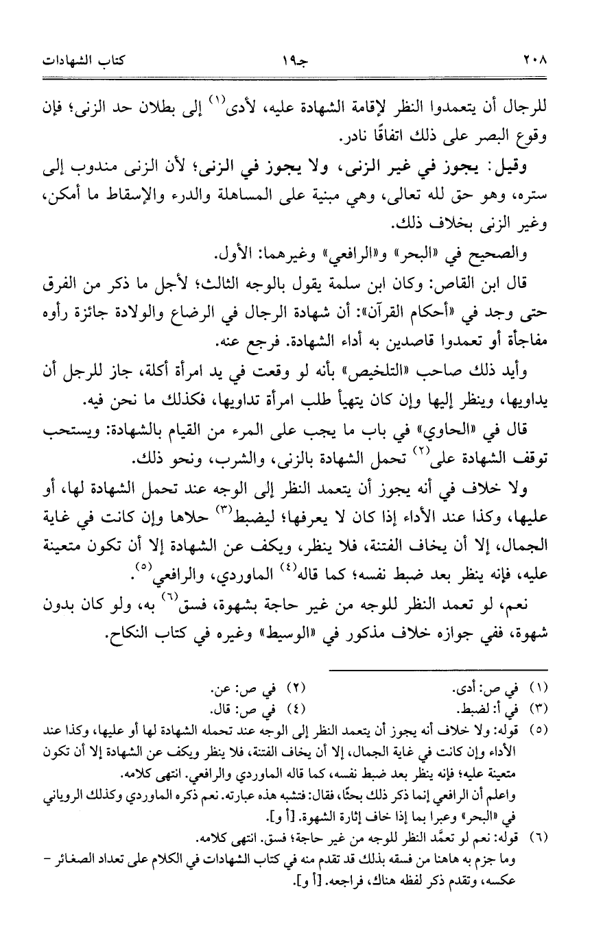 قال في ((الحاوي)) في باب ما يجب على المرء من القيام بالشهادة: ويستحب توقف الشهادة على تحمل الشهادة بالزنى، والشرب، ونحو ذلك. ولا خلاف في أنه يجوز أن يتعمد النظر إلى الوجه عند تحمل الشهادة لها، أو عليها، وكذا عند الأداء إذا كان لا يعرفها، ليضبط حلاها وإن كانت في غاية الجمال، إلا أن يخاف الفتنة، فلا ينظر، ويكف عن الشهادة إلا أن تكون متعينة عليه، فإنه ينظر بعد ضبط نفسه، كما قاله الماوردي، والرافعي.